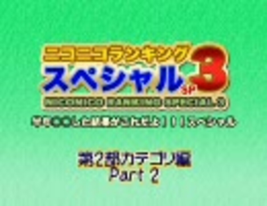 ★集計期間:2007年12月25日0時集計~2008年7月1日0時<br />★集計対象:全カテゴリ各300位(ランク外は0ポイント扱い)<br />★集計方法<br />動画ポイント:再生数+コメント数×補正値+マイリスト登録数×20<br />カテゴリポイント:カテゴリ所属動画の動画ポイントの合計<br /><br />★紹介動画へのリンクはこちらから→公開終了しました↓からぞうぞ<br />★全集計結果一覧はこちらからどうぞ→<a href="http://www39.atwiki.jp/niconicoranking/" target="_blank" rel="noopener nofollow">http://www39.atwiki.jp/niconicoranking/</a><br />★Part1→<a href="https://www.nicovideo.jp/watch/sm4089107" class="watch">sm4089107</a> Part3→<a href="https://www.nicovideo.jp/watch/sm4089469" class="watch">sm4089469</a><br />★第1部 Part1→<a href="https://www.nicovideo.jp/watch/sm4004507" class="watch">sm4004507</a> Part2→<a href="https://www.nicovideo.jp/watch/sm4002764" class="watch">sm4002764</a> Part3→<a href="https://www.nicovideo.jp/watch/sm4004636" class="watch">sm4004636</a><br /><br />
