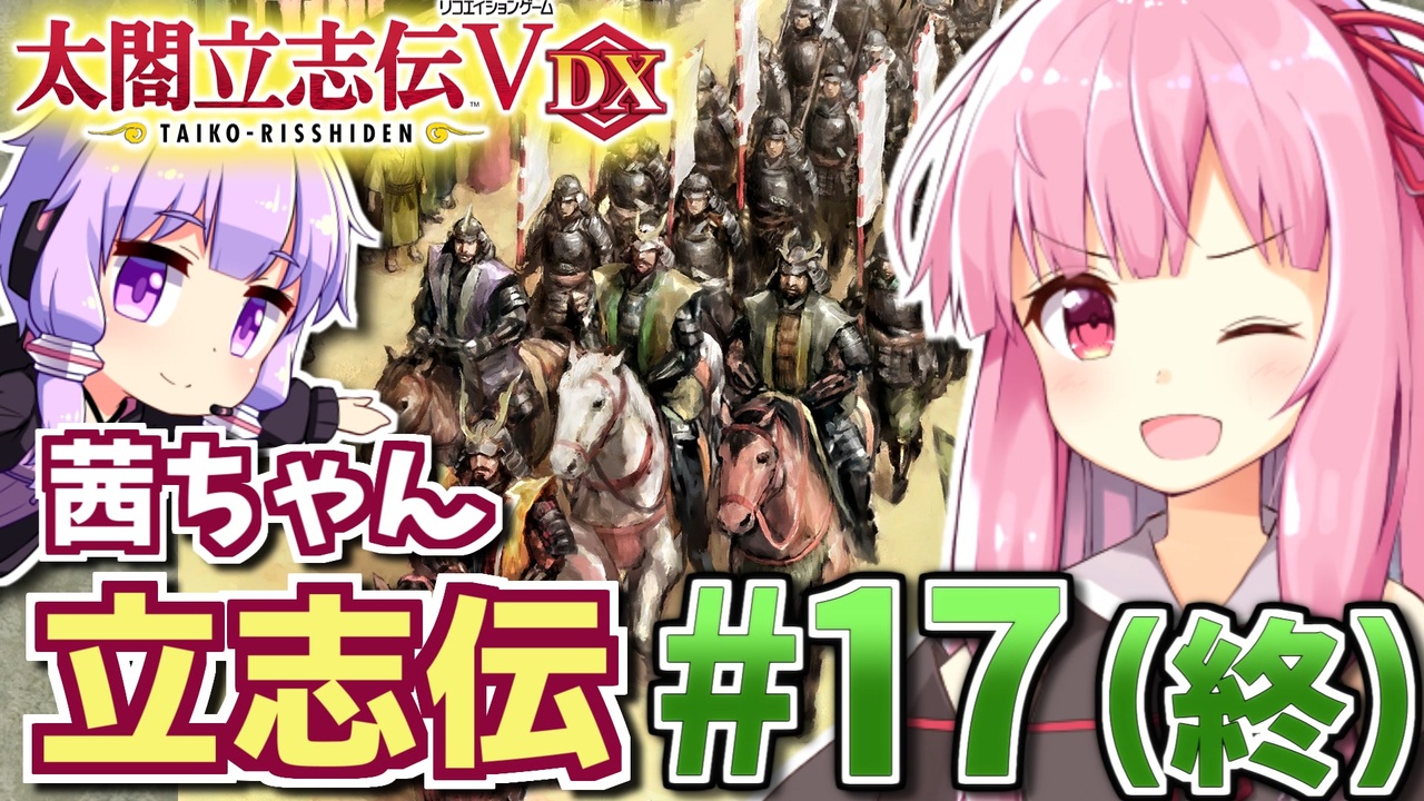 戦国時代が舞台の自由に戦国の世を生き抜く戦略SLG「太閤立志伝5 DX」を、結月ゆかりさんと琴葉茜ちゃんがうつけ型新武将でプレイします。<br>未プレイの初心者向けの丁寧な解説を加えてるのでプレイ済みの方々はご了承ください。<br>第17話はついに織田家との最終決戦です!おだ家決戦、勝つのはどっちだ!<br><br>前 : 第16話(<a href="https://www.nicovideo.jp/watch/sm40953941" class="watch">sm40953941</a>) <-> 次 : (ちょっと待っててー)<br>このシリーズのリンク: <a href="https://www.nicovideo.jp/series/323444" target="_blank" rel="noopener">series/323444</a><br><br>■ プレイ環境: 太閤立志伝V DX PC版 (Ver1.2.0)<br>著作権表示<br>©コーエーテクモゲームス<br><br />HoI4プレイ講座 → (<a href="https://www.nicovideo.jp/mylist/62136132" target="_blank" rel="noopener">mylist/62136132</a>)<br>EU4プレイ講座→(<a href="https://www.nicovideo.jp/mylist/61049948" target="_blank" rel="noopener">mylist/61049948</a>)<br>CK3プレイ講座→(<a href="https://www.nicovideo.jp/series/191974" target="_blank" rel="noopener">series/191974</a>)<br>Stellarisプレイ講座→(<a href="https://www.nicovideo.jp/series/263583" target="_blank" rel="noopener">series/263583</a>)<br>Vic3プレイ講座→(<a href="https://www.nicovideo.jp/series/364690" target="_blank" rel="noopener">series/364690</a>)<br>赤いシムシティ実況動画 → (<a href="https://www.nicovideo.jp/series/8074" target="_blank" rel="noopener">series/8074</a>)<br>太閤立志伝5 DX実況動画→ (<a href="https://www.nicovideo.jp/series/323444" target="_blank" rel="noopener">series/323444</a>)<br>信長の野望 小田家プレイ動画 → (<a href="https://www.nicovideo.jp/series/353641" target="_blank" rel="noopener">series/353641</a>)<br>紲星あかりF1参戦記→(<a href="https://www.nicovideo.jp/series/222744" target="_blank" rel="noopener">series/222744</a>)<br>あかねとあかりのソビエト国境警備隊!→ (<a href="https://www.nicovideo.jp/series/394983" target="_blank" rel="noopener">series/394983</a>)<br>Cities: Skylines2都市開発プレイ動画 → (<a href="https://www.nicovideo.jp/series/436779" target="_blank" rel="noopener">series/436779</a>)<br>Manor Lords村作りプレイ動画 → (<a href="https://www.nicovideo.jp/series/468306" target="_blank" rel="noopener">series/468306</a>)<br>全動画投稿リスト (<a href="https://www.nicovideo.jp/user/77964272" target="_blank" rel="noopener">user/77964272</a>)