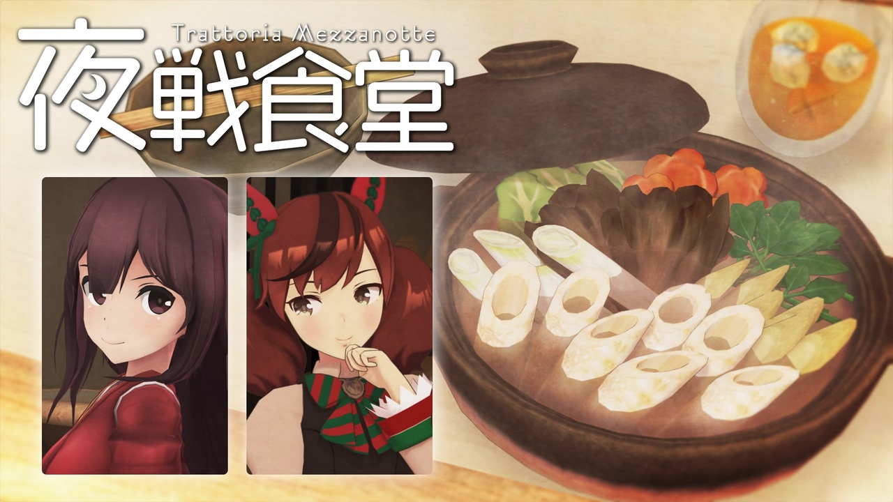 <span style="color: #000000; font-size: 14px;">―――艦娘とウマ娘が食を楽しみ、夢を語る場所。</span><br><span style="color: deeppink; font-size: 24px;">いらっしゃいませ。本日のご注文は?</span><br><strong>艦これMMD"深夜"ドラマ、「めしウマ娘」公開記念の特別営業!</strong><br>当店はランチタイムも元気に営業中!<br>ウマ娘ちゃん達にも満足して頂けるよう、ノンアルコールドリンクも多数取り揃えております。<br><br><span style="color: #0000ff; font-size: 14px;"><strong><夜戦食堂-Trattoria Mezzanotte- </strong></span><span style="color: #262626; font-size: 14px;"><a href="https://www.nicovideo.jp/mylist/68091102" target="_blank" rel="noopener">mylist/68091102</a></span><span style="color: #0000ff; font-size: 14px;"><strong>></strong></span><br>前回→第4夜(最終回)「Gambier Bayとマルゲリータ」<a href="https://www.nicovideo.jp/watch/sm39848395" class="watch">sm39848395</a><br><br><span style="color: #0000ff;"><strong><めしウマ娘-食レポステークス- </strong></span><span style="color: #262626;"><a href="https://www.nicovideo.jp/mylist/73971829" target="_blank" rel="noopener">mylist/73971829</a></span><span style="color: #0000ff;"><strong>></strong></span><br><span style="color: #ff0000; font-size: 16px;">本編→11月11日(金)21時公開!</span><span style="font-size: 18px;"><strong><a href="https://www.nicovideo.jp/watch/sm41345796" class="watch">sm41345796</a></strong></span><br><br><strong>制作:ベホイミProject(<a href="https://www.nicovideo.jp/mylist/27336" target="_blank" rel="noopener">mylist/27336</a>)</strong><br>Twitter:<a href="https://twitter.com/BehoimiP" target="_blank" rel="noopener nofollow">https://twitter.com/BehoimiP</a><br>YouTube:<a href="https://www.youtube.com/channel/UCISpbK1sLOHkvBgZFJ76ZkA" target="_blank" rel="noopener nofollow">https://www.youtube.com/channel/UCISpbK1sLOHkvBgZFJ76ZkA</a><br>欲しい物:<a href="https://www.amazon.jp/hz/wishlist/ls/22MGTQ3BVV39B?ref_=wl_share" target="_blank" rel="noopener nofollow">https://www.amazon.jp/hz/wishlist/ls/22MGTQ3BVV39B?ref_=wl_share</a>