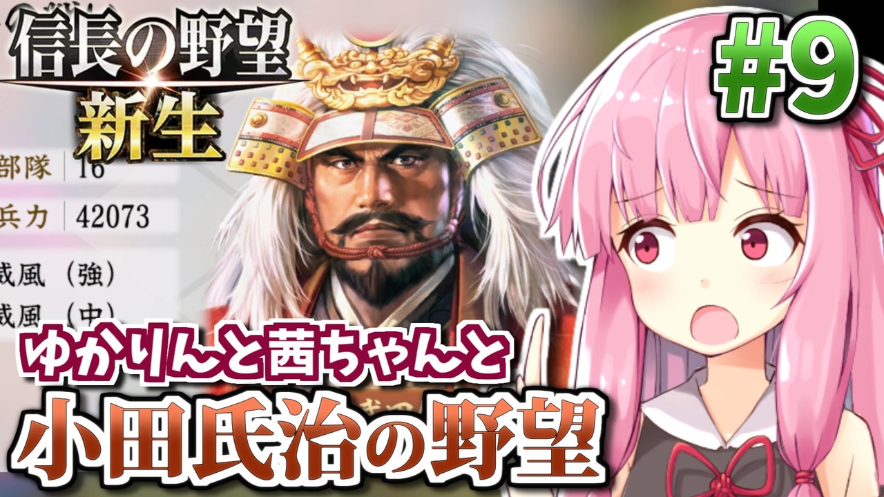 戦国時代が舞台の城取り戦略SLG「信長の野望・新生」を、軍師担当・結月ゆかりとうつけ担当・琴葉茜が小田家でプレイします。<br>未プレイの初心者向けの丁寧な解説を加えてるのでプレイ済みの方々はご了承ください。<br>第9話は武田征伐回!戦国最強騎馬隊を揃え武田家へと決戦を挑みます!<br><br>前 : (<a href="https://www.nicovideo.jp/watch/sm41367802" class="watch">sm41367802</a>) <-> 次 : (<a href="https://www.nicovideo.jp/watch/sm41780774" class="watch">sm41780774</a>)<br>このシリーズのリンク: <a href="https://www.nicovideo.jp/series/353641" target="_blank" rel="noopener">series/353641</a><br><br>■ プレイ環境: 信長の野望・新生 Steam版 (Ver1.0.6)<br>■ プレイ設定: <br> 難易度 上級 (チュートリアルなし)・歴史イベントあり 寿命: 史実<br> シナリオ 1553年・尾張統一シナリオ 小田家<br> 縛り: 他家への臣従縛り<br><br>著作権表示: ©コーエーテクモゲームス<br />HoI4プレイ講座 → (<a href="https://www.nicovideo.jp/mylist/62136132" target="_blank" rel="noopener">mylist/62136132</a>)<br>EU4プレイ講座→(<a href="https://www.nicovideo.jp/mylist/61049948" target="_blank" rel="noopener">mylist/61049948</a>)<br>CK3プレイ講座→(<a href="https://www.nicovideo.jp/series/191974" target="_blank" rel="noopener">series/191974</a>)<br>Stellarisプレイ講座→(<a href="https://www.nicovideo.jp/series/263583" target="_blank" rel="noopener">series/263583</a>)<br>Vic3プレイ講座→(<a href="https://www.nicovideo.jp/series/364690" target="_blank" rel="noopener">series/364690</a>)<br>赤いシムシティ実況動画 → (<a href="https://www.nicovideo.jp/series/8074" target="_blank" rel="noopener">series/8074</a>)<br>太閤立志伝5 DX実況動画→ (<a href="https://www.nicovideo.jp/series/323444" target="_blank" rel="noopener">series/323444</a>)<br>信長の野望 小田家プレイ動画 → (<a href="https://www.nicovideo.jp/series/353641" target="_blank" rel="noopener">series/353641</a>)<br>紲星あかりF1参戦記→(<a href="https://www.nicovideo.jp/series/222744" target="_blank" rel="noopener">series/222744</a>)<br>あかねとあかりのソビエト国境警備隊!→ (<a href="https://www.nicovideo.jp/series/394983" target="_blank" rel="noopener">series/394983</a>)<br>Cities: Skylines2都市開発プレイ動画 → (<a href="https://www.nicovideo.jp/series/436779" target="_blank" rel="noopener">series/436779</a>)<br>Manor Lords村作りプレイ動画 → (<a href="https://www.nicovideo.jp/series/468306" target="_blank" rel="noopener">series/468306</a>)<br>全動画投稿リスト (<a href="https://www.nicovideo.jp/user/77964272" target="_blank" rel="noopener">user/77964272</a>)