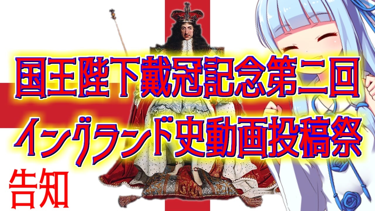 <span style="color: #ff0000; font-size: 24px;"><strong>チャールズ3世の戴冠をお祝いしましょう!</strong></span><br>新年あけましておめでとうございます。今年は国王陛下の戴冠式が行われますね。そこで、世界最強のイングランド王国について理解を深め、また関心を持つ人を増やすことを意図し、本企画を行うこととしました。<br>本投稿祭は細かいレギュレーションが多いですが、ざっくり言えば<span style="font-size: 18px;"><strong><u>解説でなくてもブリテン諸島にかすっていれば大丈夫ですし、屁理屈付けてレギュレーション準拠と主張しても構いません。</u></strong></span><span style="color: #ff0000; font-size: 24px;"><strong><u>ただし参考文献は必要数用意してください。</u></strong></span><br>名前が長いので公式略称→英蘭祭(タグは第2回英蘭祭)<br>参考動画→そのうち上げると思いますがあげられなかったら申し訳ない<br>投稿者のイングランド史はこの程度ですのでふるってご参加ください→<a href="https://www.nicovideo.jp/series/22667" target="_blank" rel="noopener">series/22667</a><br>いいねに投稿者が最初にテストして出たおみくじの結果が乗ってます。<br><br>※お御籤はわりと凶が多いです。