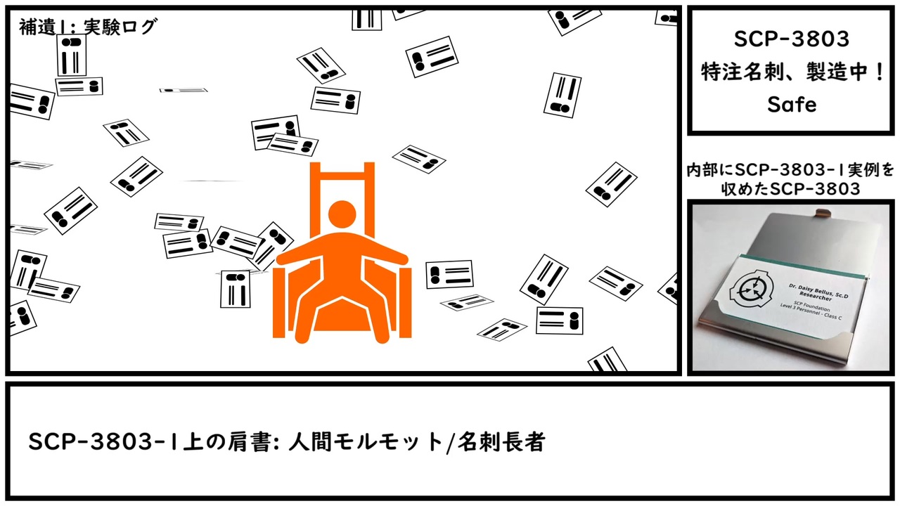 被験者: ななしぃ<br>SCP-3803-1上の肩書: 動画投稿者/人間モルモット<br><br>本家記事 <a href="https://scp-wiki.wikidot.com/scp-3803" target="_blank" rel="noopener nofollow">https://scp-wiki.wikidot.com/scp-3803</a><br>翻訳記事 <a href="http://scp-jp.wikidot.com/scp-3803" target="_blank" rel="noopener nofollow">http://scp-jp.wikidot.com/scp-3803</a><br>作者 Uncle Nicolini<br>SCP財団 <a href="http://scp-jp.wikidot.com" target="_blank" rel="noopener nofollow">http://scp-jp.wikidot.com</a><br>過去の動画はこちら <a href="https://www.nicovideo.jp/mylist/67620202" target="_blank" rel="noopener">mylist/67620202</a><br>CC BY-SA 3.0