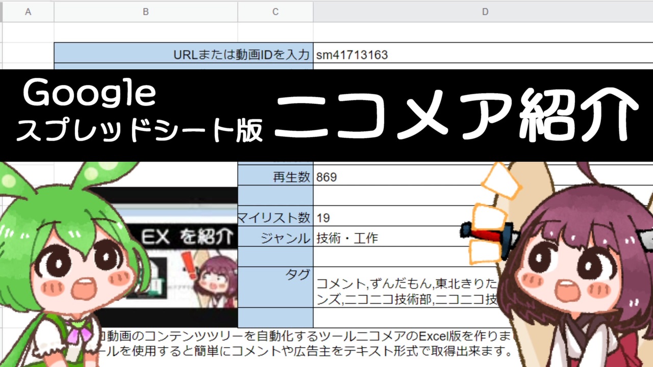 <span style="color: #ff0000; font-size: 18px;">【注意】<br>3DSサポートが終了したためコメントAPIが動作していませんでしたが新APIを解析し、Windows版、Googleスプレッドシート版、Excel版の完了しました、コンテンツツリー登録用ID対応が</span><br><a href="https://commons.nicovideo.jp/works/nc289171" target="_blank" rel="noopener">nc289171</a><br><span style="color: #ff0000; font-size: 18px;">からDL願います</span><br><br>ニコニコ動画のコンテンツツリーを自動化するツール<span style="color: #ff0000; font-size: 18px;"><strong>ニコメア</strong></span>のGoogleスプレッドシート版を作りました。<br>このツールを使用すると簡単にコメントや広告主をテキスト形式で取得出来ます。<br>今後はWindows版とGoogleスプレッドシート版に力を入れます、Excel版は今回暫定対応です<br><br>支援品リストを作りましたので気が向いたら・・・<br><a href="https://www.amazon.jp/hz/wishlist/ls/23MIFZ28DFCGG?ref_=wl_share" target="_blank" rel="noopener nofollow">https://www.amazon.jp/hz/wishlist/ls/23MIFZ28DFCGG?ref_=wl_share</a><br><br>コンテンツツリー登録用ID<br><a href="https://commons.nicovideo.jp/works/nc289171" target="_blank" rel="noopener">nc289171</a><br><br>【アプリのダウンロード】<br>ニコメアWindows版 Ver 0.42 2023/10/12 16:00 更新<br><a href="https://drive.google.com/uc?id=1DrZIVvlY_psLkpxiiXsSkbNLhUlznb_4/view" target="_blank" rel="noopener nofollow">https://drive.google.com/uc?id=1DrZIVvlY_psLkpxiiXsSkbNLhUlznb_4/view</a><br><br>ニコメア Googleスプレッドシート版 0.04 2023/04/19 15:30 更新<br><a href="https://docs.google.com/spreadsheets/d/1pyZqPNU2_renLJlQO8Rm6xA7C6EU3cFkaPJmUkNhTZE/copy" target="_blank" rel="noopener nofollow">https://docs.google.com/spreadsheets/d/1pyZqPNU2_renLJlQO8Rm6xA7C6EU3cFkaPJmUkNhTZE/copy</a><br><br>【問い合わせフォーム】<br><a href="https://forms.gle/S7tS26LbhZZgHv749" target="_blank" rel="noopener nofollow">https://forms.gle/S7tS26LbhZZgHv749</a><br><br>サポートはこちらのTwitterにて<br><a href="https://twitter.com/vramwiz" target="_blank" rel="noopener nofollow">https://twitter.com/vramwiz</a>