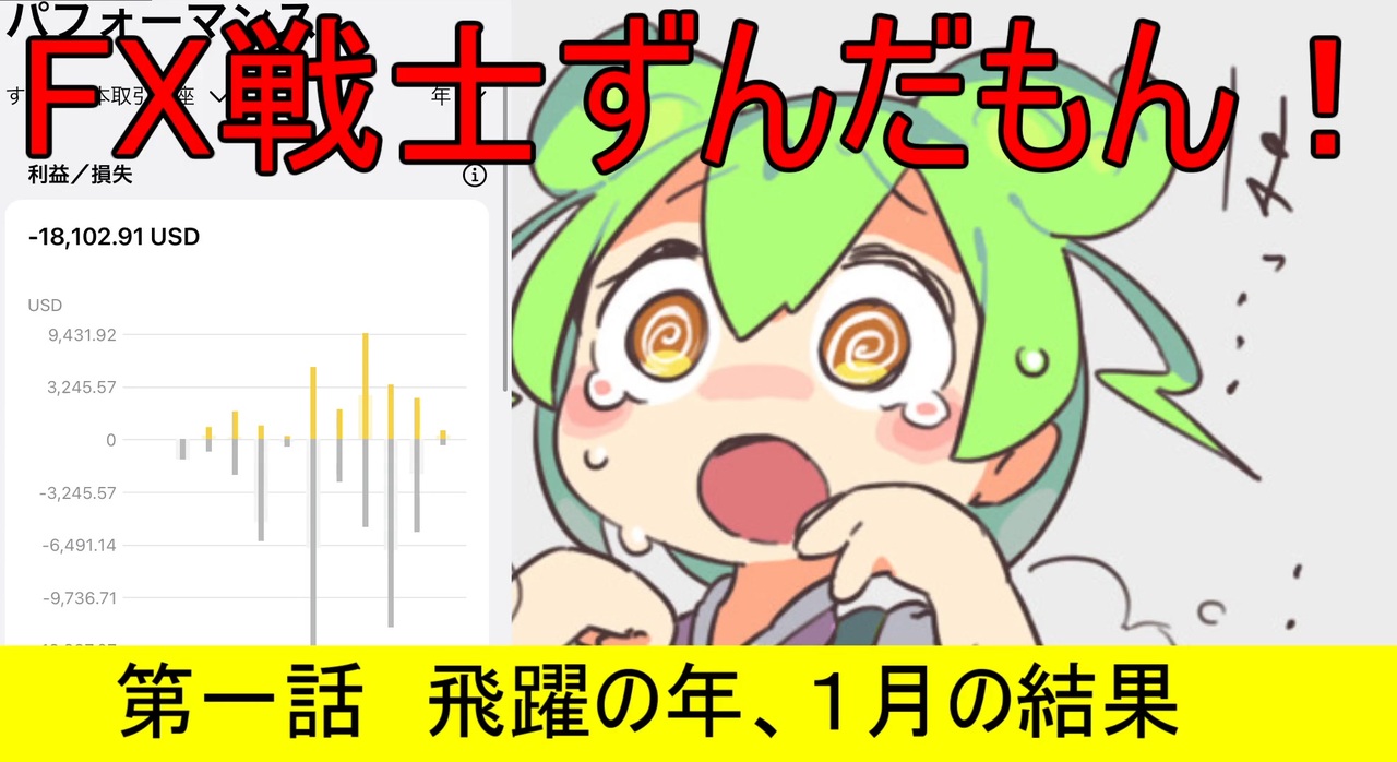 おすすめのFX口座<br><a href="https://one.exness-track.com/a/rhvs40mzk5?platform=mobile&pid=mobile_share" target="_blank" rel="noopener nofollow">https://one.exness-track.com/a/rhvs40mzk5?platform=mobile&pid=mobile_share</a><br><br>早速やらかしました。<br>実は1月の中旬くらいまではプラス7万円ほどで推移していたものの、一気にすべて失って冷静さを失いマイナス20万円ほどに。<br>使ってはいけないお金にも手をつけたりつけなかったりで結構ぎりぎりの生活を日々送っております。。。<br>2月の勝者になれるよう頑張ります。。。<br><br><strong>支援してくださる方がいらっしゃったら喜んで受け付けるのでどうぞよろしくお願いします!<br><br>フォローとかいいねとかコメントでもなんでもうれしいのでどうかアクションをどうか。。。</strong><br><br>Amazon欲しいものリスト<br><a href="https://www.amazon.jp/hz/wishlist/ls/2NG2UAR42Y4O0?ref_=wl_share" target="_blank" rel="noopener nofollow">https://www.amazon.jp/hz/wishlist/ls/2NG2UAR42Y4O0?ref_=wl_share</a><br><br>Twitter<br><a href="https://twitter.com/hairebahai" target="_blank" rel="noopener nofollow">https://twitter.com/hairebahai</a><br><br>使っているFX口座<br><br>Gemforex<br><a href="https://t.co/JPkxzvJyPx" target="_blank" rel="noopener nofollow">https://t.co/JPkxzvJyPx</a><br><br>Exness<br><a href="https://one.exness-track.com/a/rhvs40mzk5?platform=mobile&pid=mobile_share" target="_blank" rel="noopener nofollow">https://one.exness-track.com/a/rhvs40mzk5?platform=mobile&pid=mobile_share</a><br><br>FXのキャッシュバックサイトはこちら<br><br><a href="https://portal.money-charger.com/register?ref=nkB3I8YYI2tn" target="_blank" rel="noopener nofollow">https://portal.money-charger.com/register?ref=nkB3I8YYI2tn</a><br><br>現金での支援受付はこちらから<br>ペイパル<br><a href="https://t.co/TB73CcoPhg" target="_blank" rel="noopener nofollow">https://t.co/TB73CcoPhg</a><br><br>bitwallet<br>zundamonfx@gmail.com<br><br>#FX #ずんだもん #VOICEVOX