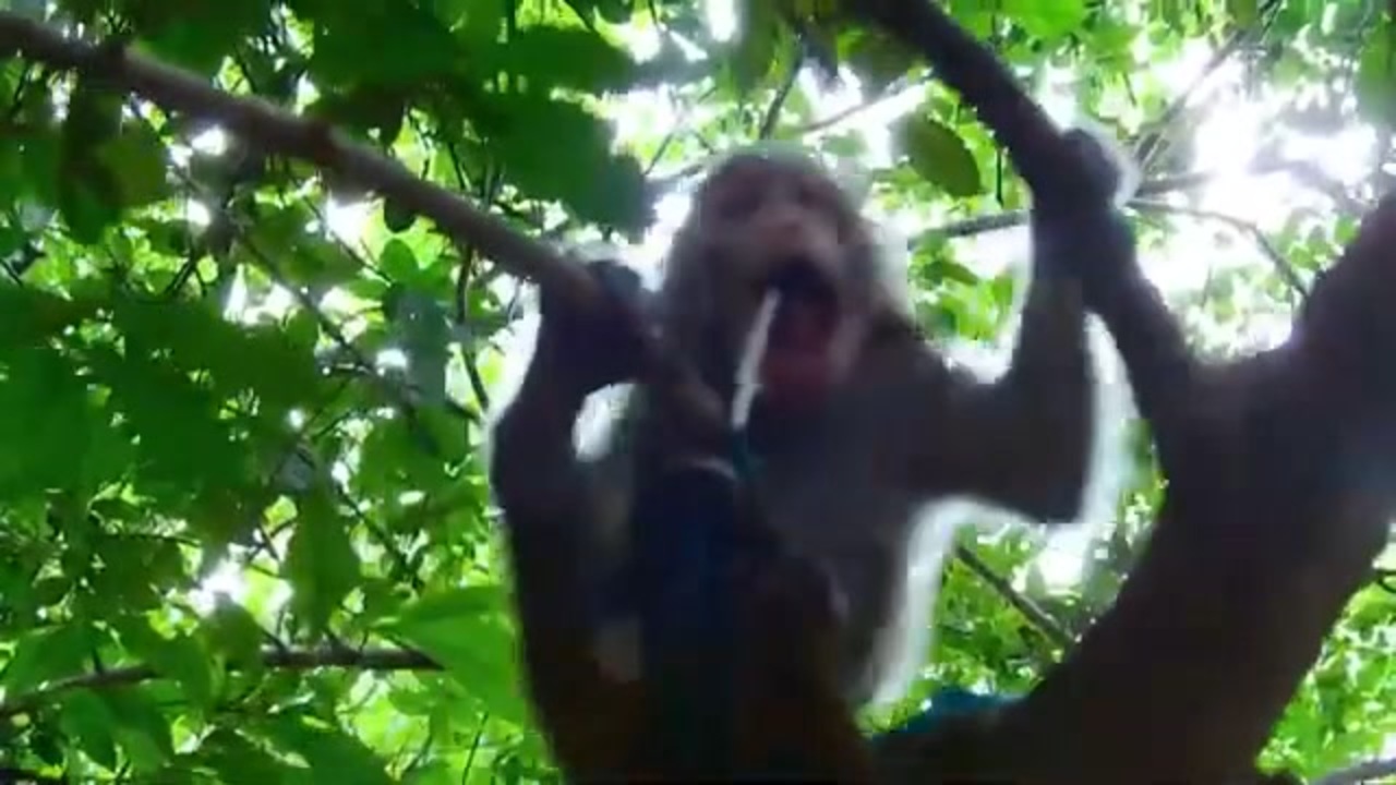 【子猿・野生】口内に金属製フックが引っかかってもがく子猿