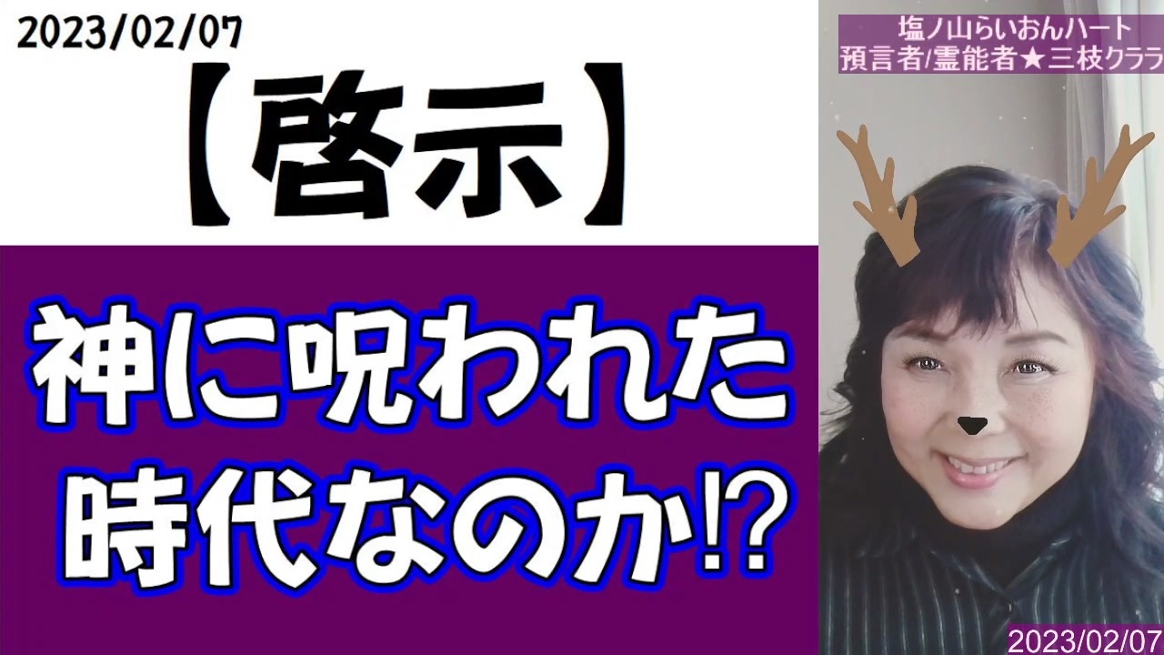 【啓示】今は神に呪われた時代なのか!? 私たち人類は呪われた存在なのか!?~2023/02/07<br><br>◆YouTubeチャンネル<br>1⃣三枝クララ(塩ノ山の預言者)<br><a href="https://youtu.be/EqhE4yI2CK8" target="_blank" rel="noopener nofollow">https://youtu.be/EqhE4yI2CK8</a><br><br />✝世界最古のピラミッド<br>塩ノ山の預言者/霊能者 三枝クララ<br><br>UFOアブダクション?されし使徒✝<br>『日本一の霊能者だと公言しなさい』と神より言われし者<br><br>神からの【啓示】を軸に、日本人が真の聖書の民である事を発信しています。<br><br>今はイエスキリスト再臨真近の終末の時代、皆で乗り越えていきましょう!<br><br>皆様の上に神の祝福がありますように!<br>光あれ!✨<br><br><br><br>#聖書<br>#預言者<br>#霊能者<br>#霊視鑑定<br>#作詞作曲<br>#甲府盆地<br>#山梨県<br>#甲州市<br>#YouTube<br><br><br>塩ノ山らいおんハートHP<br><a href="https://shionoyama.com" target="_blank" rel="noopener nofollow">https://shionoyama.com</a><br><br><br><br>