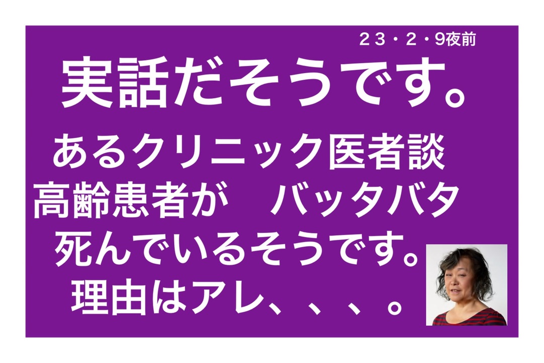 殺す為のワクチンだもの、バッタバタ死ぬの当たり前!<br />`=♣️こちらではBASEにて身体に良いものを販売しています。<br>アプリ:mitikozaza <a href="https://thebase.page.link/We9R" target="_blank" rel="noopener nofollow">https://thebase.page.link/We9R</a> <br>ウェブサイト:<a href="https://mitikozaza.base.shop/" target="_blank" rel="noopener nofollow">https://mitikozaza.base.shop/</a> <br><br>♣️BASEの商品を一部メルカリでも販売→<a href="https://www.mercari.com/jp/u/208902412/" target="_blank" rel="noopener nofollow">https://www.mercari.com/jp/u/208902412/</a> <br><br><br>※<span style="color: #ff0000;"><strong>要注目</strong></span>↓<br><strong>佐々木にはYouTube時代(3年以上)からつきまとっている</strong><span style="color: #ff9900;"><strong>アンチ</strong></span><strong>がいます。<br>佐々木がチャット上で</strong><span style="color: #ff9900;"><strong>アンチ</strong></span><strong>と思われる人物が現れた場合、躊躇なく</strong><span style="color: #ff0000;"><strong>ブロック</strong></span><strong>します。<br>アンチでない場合もあるかもしれませんが、ご了承ください。</strong><br><br>♣️ワクチン情報の配布用チラシはこちらから購入できます。<br><a href="https://www.mercari.com/jp/u/374000353/" target="_blank" rel="noopener nofollow">https://www.mercari.com/jp/u/374000353/</a><br><br><br>♣️欲しいものリスト(デモ活動に必要です。宜しくお願い致します)<br><a href="https://www.amazon.jp/hz/wishlist/ls/2G6AW5BB3QDR5?ref_=wl_share" target="_blank" rel="noopener nofollow">https://www.amazon.jp/hz/wishlist/ls/2G6AW5BB3QDR5?ref_=wl_share</a><br><br>♣️情報募集中↓<br>mitikozaza@gmail.com<br>