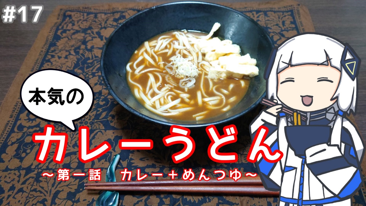 17本目。<br>カレーうどん作り、始めました。<br>「作るんだったら妥協なく」をモットーに、至高のカレーうどんを追い求めます。<br>第一話はカレーをめんつゆで割るスタイル。<br>「余り物のカレーの消費の仕方じゃん」と、侮るなかれ。<br><br>次のカレーうどん→:初夏辺りかな<br><br>カレーうどん作りのマイリストはこちらから:<a href="https://www.nicovideo.jp/mylist/74598840" target="_blank" rel="noopener">mylist/74598840</a><br>可不の調理実習室のマイリストはこちらから:<a href="https://www.nicovideo.jp/mylist/74018156" target="_blank" rel="noopener">mylist/74018156</a><br><br>コメントやいいね、チャンネル登録して頂けると喜びます。<br>Twitterもフォローして頂けるとさらに喜びます→<a href="https://twitter.com/afterglow9702" target="_blank" rel="noopener nofollow">https://twitter.com/afterglow9702</a><br><br>使用ツール:NodoAme(作:いぬいぬGames様 <a href="https://www.nicovideo.jp/watch/sm98013232" class="watch">sm98013232</a>)<br>演技指導:すずきつづみ(Cevio AI)<br>立ち絵:はゆ茶様 <a href="https://www.nicovideo.jp/watch/sm39971378" class="watch">sm39971378</a> <a href="https://seiga.nicovideo.jp/seiga/im10877460" target="_blank" rel="noopener">im10877460</a><br>エンドカード:Pleia90様 <a href="https://twitter.com/pleia90" target="_blank" rel="noopener nofollow">https://twitter.com/pleia90</a><br>BGM:MusMus様 <a href="https://musmus.main.jp" target="_blank" rel="noopener nofollow">https://musmus.main.jp</a><br>SE:効果音ラボ様 <a href="https://soundeffect-lab.info" target="_blank" rel="noopener nofollow">https://soundeffect-lab.info</a><br><br>※今回のレシピはハウス食品・FOODIE様を参考にしています。