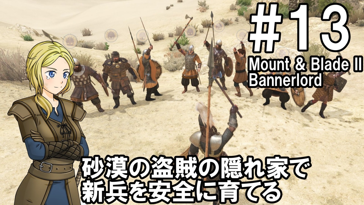 騎士のお姉さんによるMount & Blade 2 Bannerlord実況動画です<br>街や村の紹介文を読んでいると国によって同じ海でも呼称が違うあたり<br>設定が細かくて面白いですね<br>今回は砂漠地帯といえば盗賊の隠れ家というくらい<br>コンパニオンや新兵を育てるのに適した訓練場を紹介していきます<br><br><span style="color: #ff0000;"><strong>動画を楽しんでいただけたら、いいねボタンもよろしくお願いします!</strong></span><br><br>ゲーム:Mount & Blade II: Bannerlord<br><a href="https://store.steampowered.com/app/261550/Mount__Blade_II_Bannerlord/" target="_blank" rel="noopener nofollow">https://store.steampowered.com/app/261550/Mount__Blade_II_Bannerlord/</a><br>※動画はv1.0.3で録画したものです<br>最新のv1.1.0は様子を見て大きな問題がなさそうなら更新します<br><br>モード:サンドボックス<br><br>難易度:Bannerlord<br><br>使用MOD<br>・Harmony Fonts<br> フォントをHarmonyOSに差し替えて公式翻訳のひどい文字化けを解消する<br> <a href="https://www.nexusmods.com/mountandblade2bannerlord/mods/4144" target="_blank" rel="noopener nofollow">https://www.nexusmods.com/mountandblade2bannerlord/mods/4144</a><br>・RTS Camera<br> 街を紹介するための撮影で使用<br> <a href="https://www.nexusmods.com/mountandblade2bannerlord/mods/355" target="_blank" rel="noopener nofollow">https://www.nexusmods.com/mountandblade2bannerlord/mods/355</a><br><br>動画内SE<br>・効果音ラボ:<a href="https://soundeffect-lab.info" target="_blank" rel="noopener nofollow">https://soundeffect-lab.info</a><br><br>マイリスト:<a href="https://www.nicovideo.jp/mylist/74184273" target="_blank" rel="noopener">mylist/74184273</a><br><br><span style="color: #ff0000;"><strong>Youtube(高画質版)</strong></span><br>一気見総集編#11~#22:<a href="https://youtu.be/5WiQilpcCw4" target="_blank" rel="noopener nofollow">https://youtu.be/5WiQilpcCw4</a><br>単体#13:<a href="https://youtu.be/25MGPMq_A0w" target="_blank" rel="noopener nofollow">https://youtu.be/25MGPMq_A0w</a>