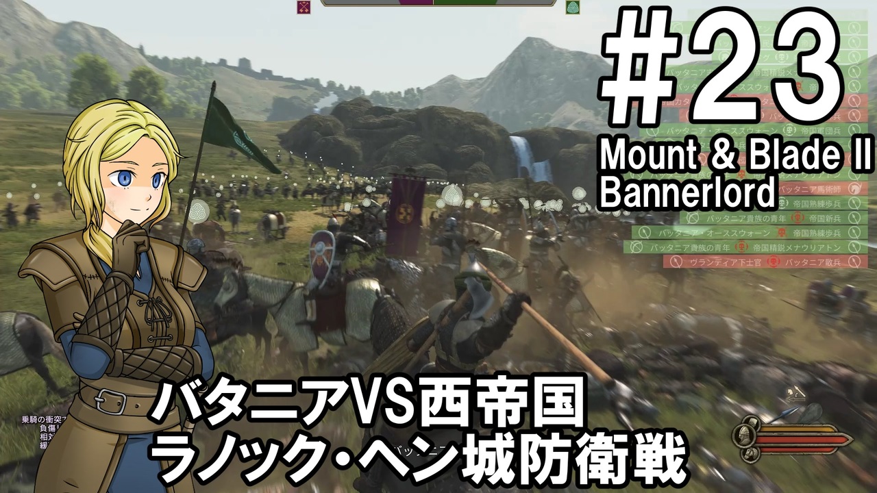 騎士のお姉さんによるMount & Blade 2 Bannerlord実況動画です<br>バタニアへ戻って西帝国軍と戦っていきます<br>ここから少しの間 中規模戦闘が続くと思います<br><br><span style="color: #ff0000;"><strong>動画を楽しんでいただけたら、いいねボタンもよろしくお願いします!</strong></span><br><br>ゲーム:Mount & Blade II: Bannerlord<br><a href="https://store.steampowered.com/app/261550/Mount__Blade_II_Bannerlord/" target="_blank" rel="noopener nofollow">https://store.steampowered.com/app/261550/Mount__Blade_II_Bannerlord/</a><br>※v1.1.3でプレイしています<br><br>モード:サンドボックス<br><br>難易度:Bannerlord<br><br>使用MOD<br>・RTS Camera<br>街を紹介するための撮影で使用<br><a href="https://www.nexusmods.com/mountandblade2bannerlord/mods/355" target="_blank" rel="noopener nofollow">https://www.nexusmods.com/mountandblade2bannerlord/mods/355</a><br><br>動画内SE<br>・効果音ラボ:<a href="https://soundeffect-lab.info" target="_blank" rel="noopener nofollow">https://soundeffect-lab.info</a><br><br>マイリスト:<a href="https://www.nicovideo.jp/mylist/74184273" target="_blank" rel="noopener">mylist/74184273</a><br><br><span style="color: #ff0000;"><strong>Youtube(高画質版)</strong></span><br>一気見総集編#23~#35:<a href="https://youtu.be/KEp4dn67qKw" target="_blank" rel="noopener nofollow">https://youtu.be/KEp4dn67qKw</a><br>単体#23:<a href="https://youtu.be/cSx3vy5XGuE" target="_blank" rel="noopener nofollow">https://youtu.be/cSx3vy5XGuE</a>