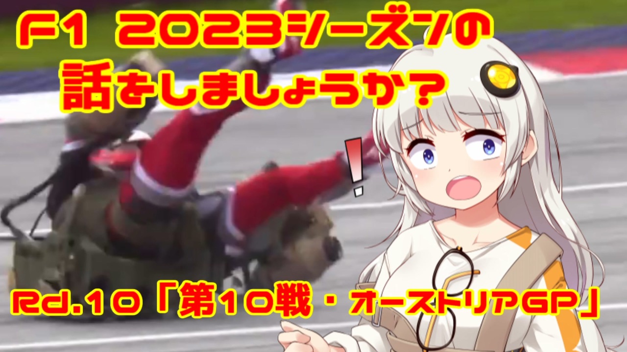 「危ない!!」by紲星あかり<br><br><br>おはこんばんちは、紲星あかりです。<br>この動画は、F1 2023年シーズンをダイジェストでお送りしています。<br>今回は第10戦・オーストリアGPをお送りします。<br>開幕からの連勝を「8」とし、まさに無双状態のレッドブル。今回開催される<br>チームのホームサーキット、レッドブル・リンクでもその強さを発揮するのでしょうか?<br><br><br><br><br><br><span style="color: red;">(ご注意)この動画の情報は真実とは限りません。また、誤字・脱字が含まれる場合があります。ご了承ください。</span><br><br>前→第9戦・カナダGP <a href="https://www.nicovideo.jp/watch/sm42391456" class="watch">sm42391456</a><br>次→第11戦・イギリスGP <a href="https://www.nicovideo.jp/watch/sm42478985" class="watch">sm42478985</a><br><br><br>F12023シーズンの話をしましょうか?マイリスト→<a href="https://www.nicovideo.jp/mylist/74761174" target="_blank" rel="noopener">mylist/74761174</a><br> <br><br>うp主のF1動画シリーズ<br><br>F12022シーズンの話をしましょうか?マイリスト→<a href="https://www.nicovideo.jp/mylist/72892585" target="_blank" rel="noopener">mylist/72892585</a><br>F12021シーズンの話をしましょうか?マイリスト→<a href="https://www.nicovideo.jp/mylist/70735663" target="_blank" rel="noopener">mylist/70735663</a><br>F12020シーズンの話をしましょうか?マイリスト→<a href="https://www.nicovideo.jp/mylist/67651731" target="_blank" rel="noopener">mylist/67651731</a> <br>F12019シーズンの話をしましょうか?<span style="color: #000000; font-size: 14px;">マイリスト</span><span style="color: #000000; font-size: 13px;">→</span><a href="https://www.nicovideo.jp/mylist/64678414" target="_blank" rel="noopener">mylist/64678414</a><br>F12018シーズンの話をしましょうか?<span style="color: #000000; font-size: 14px;">マイリスト</span><span style="color: #000000; font-size: 13px;">→</span><a href="https://www.nicovideo.jp/mylist/61514606" target="_blank" rel="noopener">mylist/61514606</a><br>F1の話をしましょうか?マイリスト→<a href="https://www.nicovideo.jp/mylist/40499353" target="_blank" rel="noopener">mylist/40499353</a><br>F1の話をしましょうか?OPフルバージョン→<a href="https://www.nicovideo.jp/mylist/59030210" target="_blank" rel="noopener">mylist/59030210</a><br>F1 CM集→<a href="https://www.nicovideo.jp/mylist/57297507" target="_blank" rel="noopener">mylist/57297507</a><br><br>