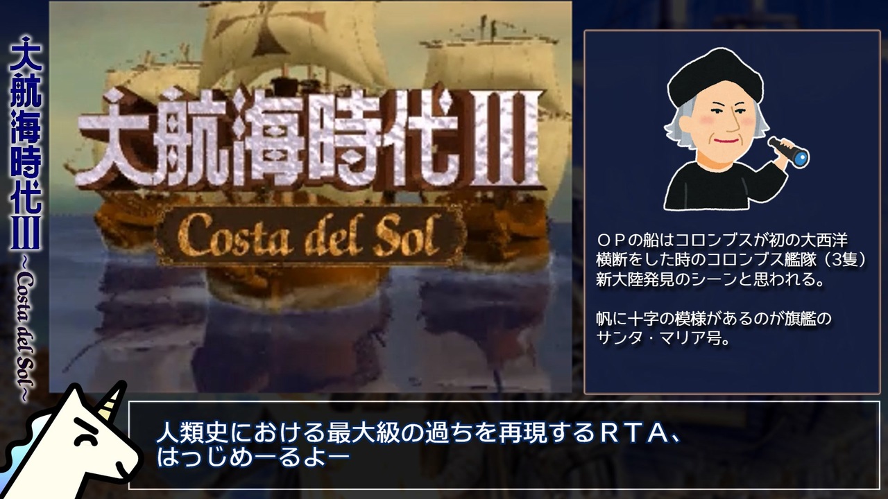 夏が辛いので初投稿です(でも花火やカキ氷は好き)<br>記念すべきRTA第10弾は1996年発売、光栄制作のWindows95専用ゲーム『大航海時代Ⅲ~Costa del Sol~』です。<br><br>自分で目標を作るゲームは評価されにくいって、それ一番言われているから。<br>解説で触れた『Slave Voyage』→<a href="https://www.slavevoyages.org/" target="_blank" rel="noopener nofollow">https://www.slavevoyages.org/</a><br><br>前作【【GB】TWIN(ツイン)せんしRTA】→<a href="https://www.nicovideo.jp/watch/sm42048100" class="watch">sm42048100</a><br>part.2→<a href="https://www.nicovideo.jp/watch/sm42723572" class="watch">sm42723572</a><br><br>導入で宣伝したKerbal Space Program ムン往還RTA→<a href="https://www.nicovideo.jp/watch/sm41752471" class="watch">sm41752471</a><br><br>走ったRTAのpart.1まとめ→<a href="https://www.nicovideo.jp/mylist/73222388" target="_blank" rel="noopener">mylist/73222388</a><br>RTA全部まとめ→<a href="https://www.nicovideo.jp/mylist/72786007" target="_blank" rel="noopener">mylist/72786007</a><br><br><u>▽レギュレーション</u><br>タイマー開始:メインメニューで『NEW GAME』→『新しいキャラクターを作成する』をクリックした瞬間<br>タイマー終了:ポルトガル王に発見物の『奴隷』を報告後、交易所で実際に売却した瞬間<br><br><u>その他のルール</u><br>・新大陸の発見物は発見不可<br>・プレゼンは必ずポルトガル王に行う<br><br>ーーーーーーーーーーーーーー<br><br>〇Twitter(現:X)→@Nagisa381rta<br><br>〇Youtubeでも活動しているのでチャンネル登録よろしくです<br>→<a href="https://www.youtube.com/channel/UCTNItIdl_gYr9N2j0PO-82g" target="_blank" rel="noopener nofollow">https://www.youtube.com/channel/UCTNItIdl_gYr9N2j0PO-82g</a><br><br>〇欲しいものリスト<br>→<a href="https://www.amazon.jp/hz/wishlist/ls/1S72L30BVRILK?ref_=wl_share" target="_blank" rel="noopener nofollow">https://www.amazon.jp/hz/wishlist/ls/1S72L30BVRILK?ref_=wl_share</a><br><br>〇今までの調査結果や攻略法をまとめた個人wiki(矛盾)を作りました<br>→<a href="https://w.atwiki.jp/nagisa381rta/" target="_blank" rel="noopener nofollow">https://w.atwiki.jp/nagisa381rta/</a><br><br>©コーエーテクモゲームス<br><br><a target="_blank" href="https://qa.nicovideo.jp/faq/show/19424?site_domain=default" style="font-size: 13px;color: #657586; text-decoration: underline; line-height: 1.4">この動画は投稿者によって修正されました</a>