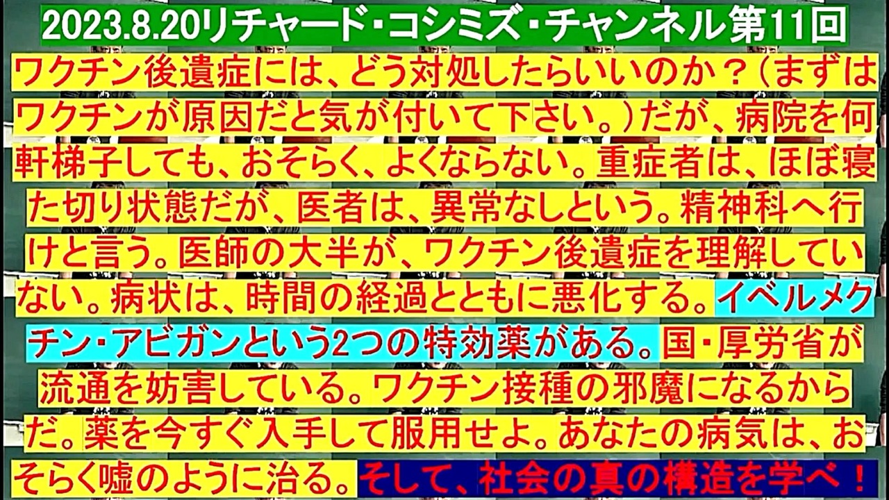 <span style="color: #ff0000;"><strong>「『 ワクチン後遺症 』には、どう対処したらいいのか?( まずは、『 ワクチン 』が『 原因 』だと気が<br> 付いて下さい )だが、『 病院 』を『 何軒梯子 』しても、おそらく、よくならない。『 重症者 』は、<br> ほぼ『 寝た切り状態 』だが、『 医者 』は、『 異常なし 』という。『 精神科へ行け 』と言う。『 医<br> 師』の『 大半 』が、『 ワクチン後遺症 』を『 理解 』していない。『 病状 』は、『 時間 』の『 経過 』<br> とともに『 悪化 』する。『 イベルメクチン 』・『 アビガン 』という『 2つ 』の『 特効薬 』がある。<br> 『 国 』・『 厚労省 』が『 流通 』を『 妨害 』している。『 ワクチン接種 』の『 邪魔 』になるからだ。<br> 『 薬 』を今すぐ『 入手 』して『 服用 』せよ。あなたの『 病気 』は、おそらく『 嘘 』のように『 治<br> る 』。そして、『 社会 』の『 真の構造 』を学べ! 」</strong></span><br><br><span style="color: #0000ff;"><strong>「『 イベルメクチン・アビガン・その他コロナ対策 』について、ご意見をお寄せ下さい! 」<br> ◐ E-mail:richardkoshimizu@gmail.com</strong></span><br><br><strong>◐「クリエイター・サポート」・「ニコニ広告」・「フォロー」等、ご協力の程宜しくお願い致します。RK</strong><br><br><span style="color: #38761d;"><strong>◐ リチャード・コシミズ 講演会 公式 動画ギャラリー</strong></span><br> <span style="color: #38761d;"><strong><a href="http://www.t-sskk.com/richardkoshimizu/video-gallery/index.html" target="_blank" rel="noopener nofollow">http://www.t-sskk.com/richardkoshimizu/video-gallery/index.html</a><br><br>◐ リチャード・コシミズ 講演会 「 ニコニコ生放送『 LIVE 』」</strong></span><br> <span style="color: #38761d;"><strong><a href="https://bit.ly/3Bx8F5w" target="_blank" rel="noopener nofollow">https://bit.ly/3Bx8F5w</a><br><br>◐ リチャード・コシミズ 『 ニコニコ チャンネル 』</strong></span><br> <span style="color: #38761d;"><strong><a href="https://ch.nicovideo.jp/richardkoshimizu" target="_blank" rel="noopener nofollow">https://ch.nicovideo.jp/richardkoshimizu</a></strong></span>