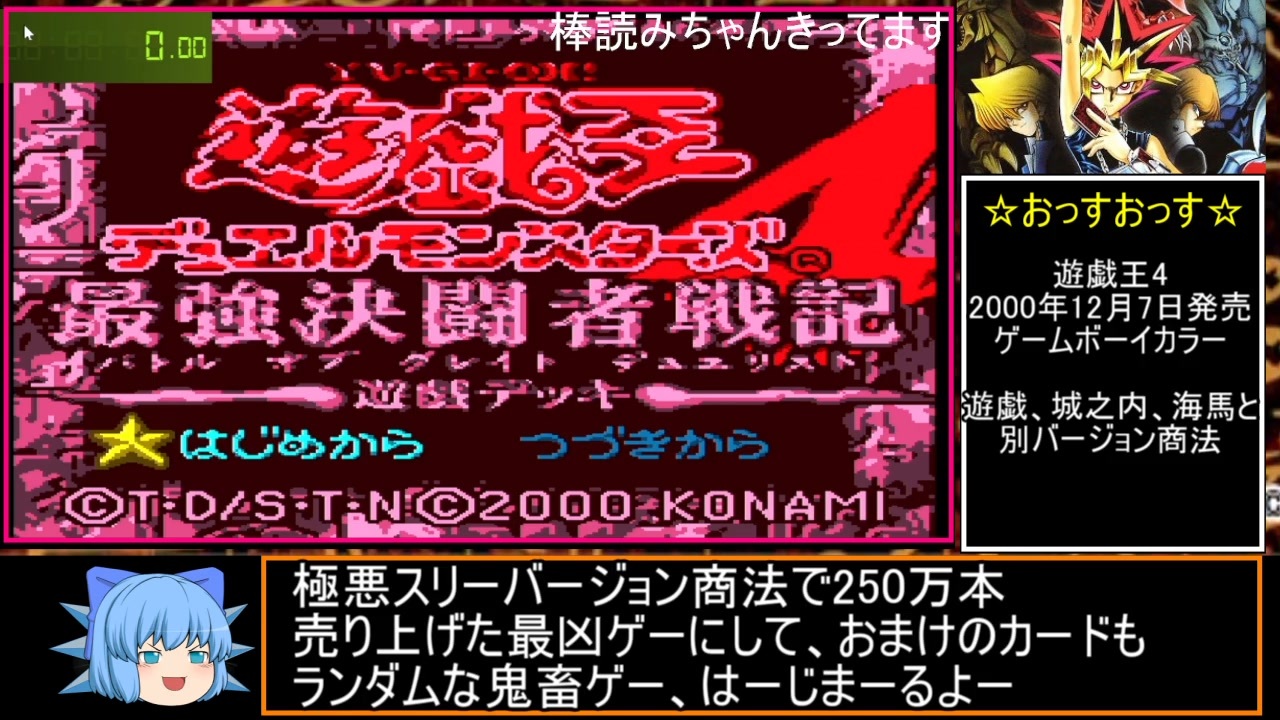 思い出深いゲーム、遊戯王4のRTAです。<br>遊戯デッキで今回は走りました。<br><span style="color: #ff0000; font-size: 18px;"><strong>※録画ミスで画面に「棒読みちゃんきってます」<br>と表示されてますが、ムシしてください!</strong></span><br><br>パート2 <a href="https://www.nicovideo.jp/watch/sm42670092" class="watch">sm42670092</a><br><br><br>遊戯王4のマイリスト <a href="https://www.nicovideo.jp/mylist/75635591" target="_blank" rel="noopener">mylist/75635591</a><br><br>他のpart1たち <a href="https://www.nicovideo.jp/mylist/45700284" target="_blank" rel="noopener">mylist/45700284</a><br><br>遊戯王4のチャート <a href="https://kaluahmirk.hatenablog.com/entry/2023/08/22/124226" target="_blank" rel="noopener nofollow">https://kaluahmirk.hatenablog.com/entry/2023/08/22/124226</a><br><br>コミュ co2498969<br><br>フォローよろしく! <a href="https://twitter.com/kahlua2525" target="_blank" rel="noopener nofollow">https://twitter.com/kahlua2525</a><br><br>みなさん広告ありがとうございます!励みになります!!<br>コメントも拝見しています!<br>楽しいコメントいつもありがとうです!