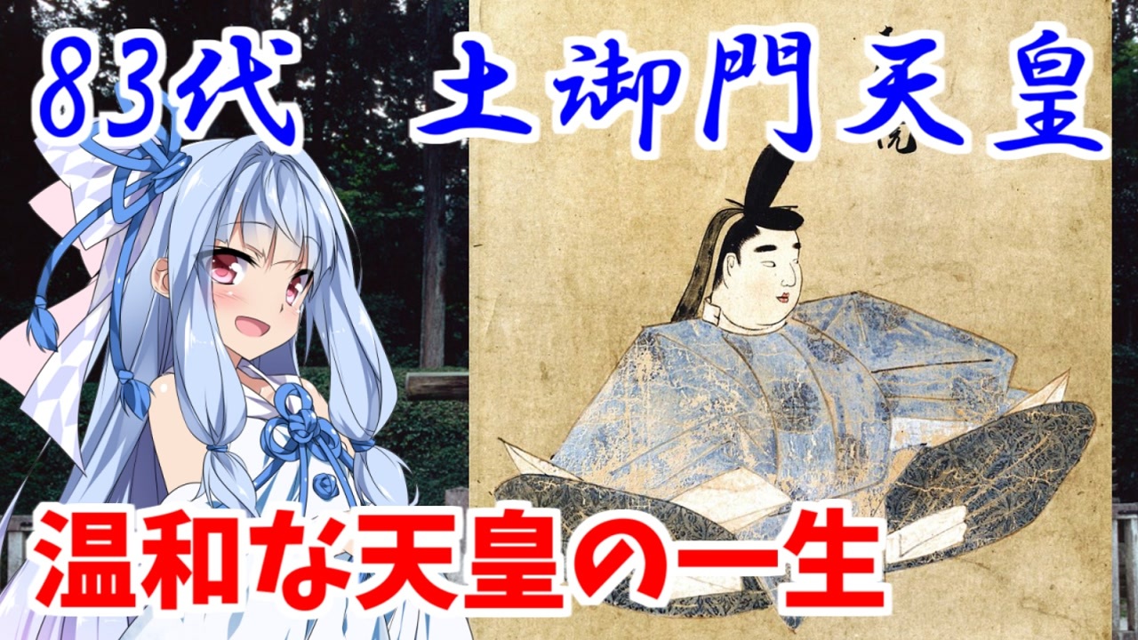 父や弟と違って穏やかな性格だったために譲位させられ、<br>政治からは遠ざけられた上に流罪先で崩御した一方、<br>幕府に好意を持たれたので子孫は繁栄していく。<br><br>「人間万事塞翁が馬」とはまさにこの天皇のこと。<br><br>●土御門(つちみかど)天皇 基本プロフィール<br> 父 後鳥羽天皇 (第一皇子) 母 源在子(能円娘、源通親養女)<br> 在位 1198年 ~ 1210年 (13年間) <br> 生涯 1195年 ~ 1231年 (37歳)<br><br>●1代目 神武天皇 → <a href="https://www.nicovideo.jp/watch/sm33459779" class="watch">sm33459779</a> <br> 82代目 後鳥羽天皇 → <a href="https://www.nicovideo.jp/watch/sm43755203" class="watch">sm43755203</a> 84代目 順徳天皇 → <a href="https://www.nicovideo.jp/watch/sm43843743" class="watch">sm43843743</a><br><br>●このころの世界<br> 1198年 ドイツ騎士団が公認される<br> 1204年 第四回十字軍がコンスタンティノープルを占領する<br> 1206年 チンギス=ハンが「モンゴル帝国」を建国する<br><br>●参考文献一覧 (下の方に掲載する予定です)<br> <a href="https://inocchi-douga.com/tennou/kamakura.html" target="_blank" rel="noopener nofollow">https://inocchi-douga.com/tennou/kamakura.html</a><br><br>●3分天皇紹介リスト → <a href="https://www.nicovideo.jp/mylist/62530271" target="_blank" rel="noopener">mylist/62530271</a> <br>●いのっちHP! → <a href="https://inocchi-douga.com/" target="_blank" rel="noopener nofollow">https://inocchi-douga.com/</a><br>●ついったー <a href="https://twitter.com/inocchi_0515" target="_blank" rel="noopener nofollow">https://twitter.com/inocchi_0515</a><br><br>●世界史べーた(仮)関連<br> 公式チャンネル! <a href="https://www.youtube.com/@sekaishibeta" target="_blank" rel="noopener nofollow">https://www.youtube.com/@sekaishibeta</a><br> 公式HP! <a href="https://sekaishi-beta.com" target="_blank" rel="noopener nofollow">https://sekaishi-beta.com</a><br> 公式X! <a href="https://twitter.com/sekaishibeta" target="_blank" rel="noopener nofollow">https://twitter.com/sekaishibeta</a><br>