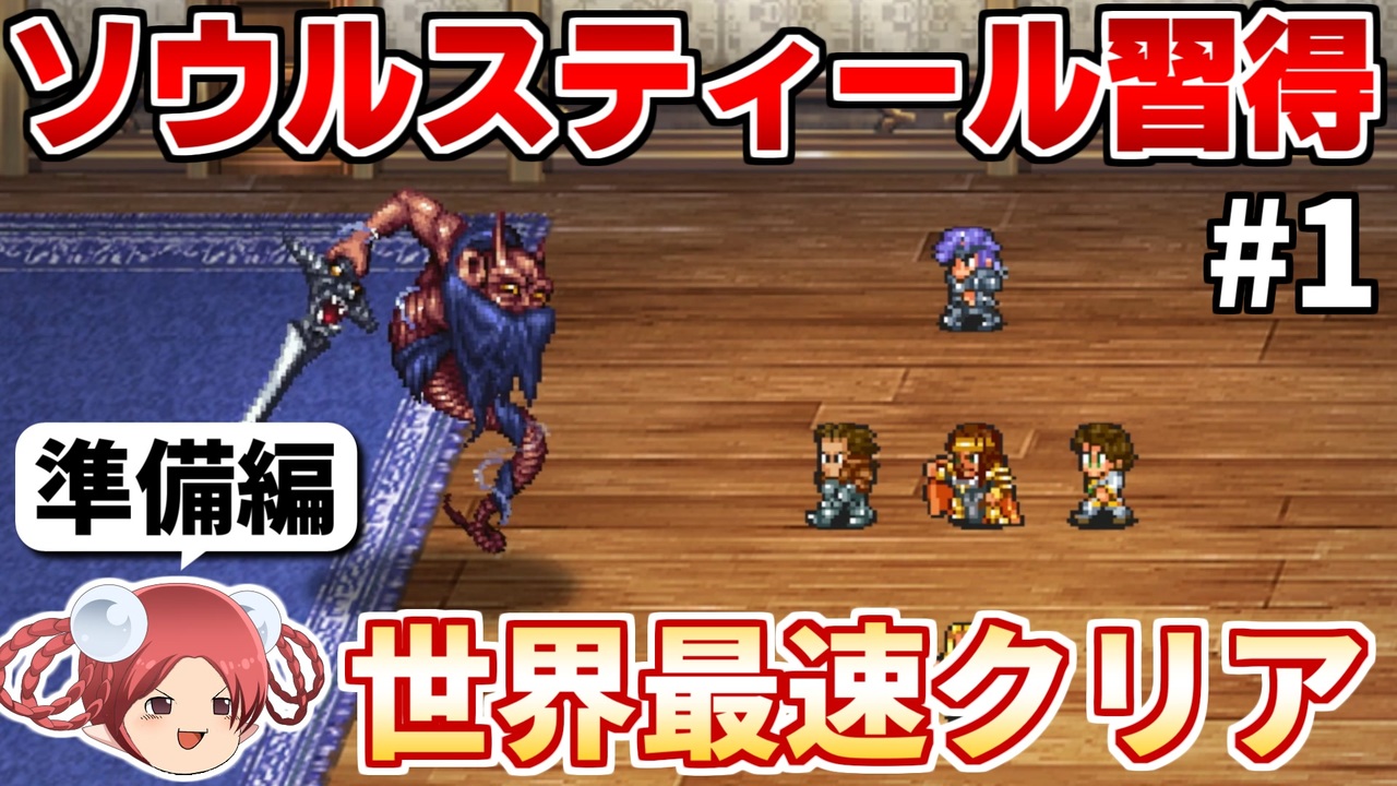 挑戦シリーズ121回目。<br>今回はロマンシングサガ2HDリマスターのタップバグを利用してクジンシーの得意技「ソウルスティール」を味方に習得させるチャートを組みました。<br>2024年7月26日時点でのRTA世界記録です。<br>Steam版でプレイしています。<br><br>【レギュレーション】<br>計測開始:NEW GAME押下<br>計測終了:EDロゴ表示<br>禁止事項:セーブデータの事前作成<br>許容事項:RTA中に作った枝セーブの利用<br> 追加コンテンツ<br><br>part2→<a href="https://www.nicovideo.jp/watch/sm43904587" class="watch">sm43904587</a><br><br>生放送アーカイブ→<a href="https://www.youtube.com/playlist?list=PLrkOMyVpbtkd7Baw8DxlqsFk7DVkfTFXz" target="_blank" rel="noopener nofollow">https://www.youtube.com/playlist?list=PLrkOMyVpbtkd7Baw8DxlqsFk7DVkfTFXz</a><br>ロマサガ2リマスター版RTA in 2:24:27→<a href="https://www.nicovideo.jp/series/160420" target="_blank" rel="noopener">series/160420</a><br>ロマサガ2 最少戦闘回数クリアに挑戦→<a href="https://www.nicovideo.jp/series/160411" target="_blank" rel="noopener">series/160411</a><br>実機サブフレームリセットでソウルスティールを覚えてみた(SFC版)→<a href="https://www.nicovideo.jp/watch/sm34516488" class="watch">sm34516488</a> <br>【ロマサガ2リマスター】ソウルスティールを習得する方法(パルポロ氏)→<a href="https://www.nicovideo.jp/watch/sm40417264" class="watch">sm40417264</a><br><br>他の挑戦シリーズとか→<a href="https://www.nicovideo.jp/mylist/3220744" target="_blank" rel="noopener">mylist/3220744</a> <br>YouTube版→<a href="https://goo.gl/oey5Y7" target="_blank" rel="noopener nofollow">https://goo.gl/oey5Y7</a><br>ニコニコニュースのインタビュー記事→<a href="https://originalnews.nico/284602" target="_blank" rel="noopener nofollow">https://originalnews.nico/284602</a><br><br>© 1993,2010,2016,2017 SQUARE ENIX CO., LTD. All Rights Reserved.<br>Planned & Developed by ArtePiazza<br>ILLUSTRATION:TOMOMI KOBAYASHI<br>CG Illustration : ArtePiazza<br>当該作品の転載・配布は禁止いたします。