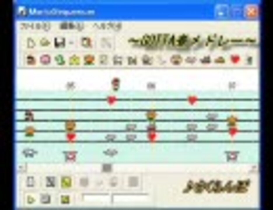 『職人24人による「マリオシーケンサ(+α)で組曲」』(<a href="https://www.nicovideo.jp/watch/sm968159" class="watch">sm968159</a>)に引き続き、マリオシーケンサ使いが集まって合作しました。今回は、様々なニコニコメドレーの一部を繋ぎ合わせて一つのメドレーにしています。予定よりも制作が長引いて公開が遅くなりましたが、結果として前回の合作の1周年記念になっちゃったみたいです。 【追記】コメントで「各譜面の制作者を書いてほしい」という旨のものが時折見られますが、制作したのはみんなです。前回とは異なり、個人で作成した譜面とは限らず、複数人で共同制作している譜面が多いため、譜面ごとに制作者を掲載することは事実上不可能です。 【追記その2】合作第三弾『七色のニコニコ動画』<a href="https://www.nicovideo.jp/watch/sm7276594" class="watch">sm7276594</a>