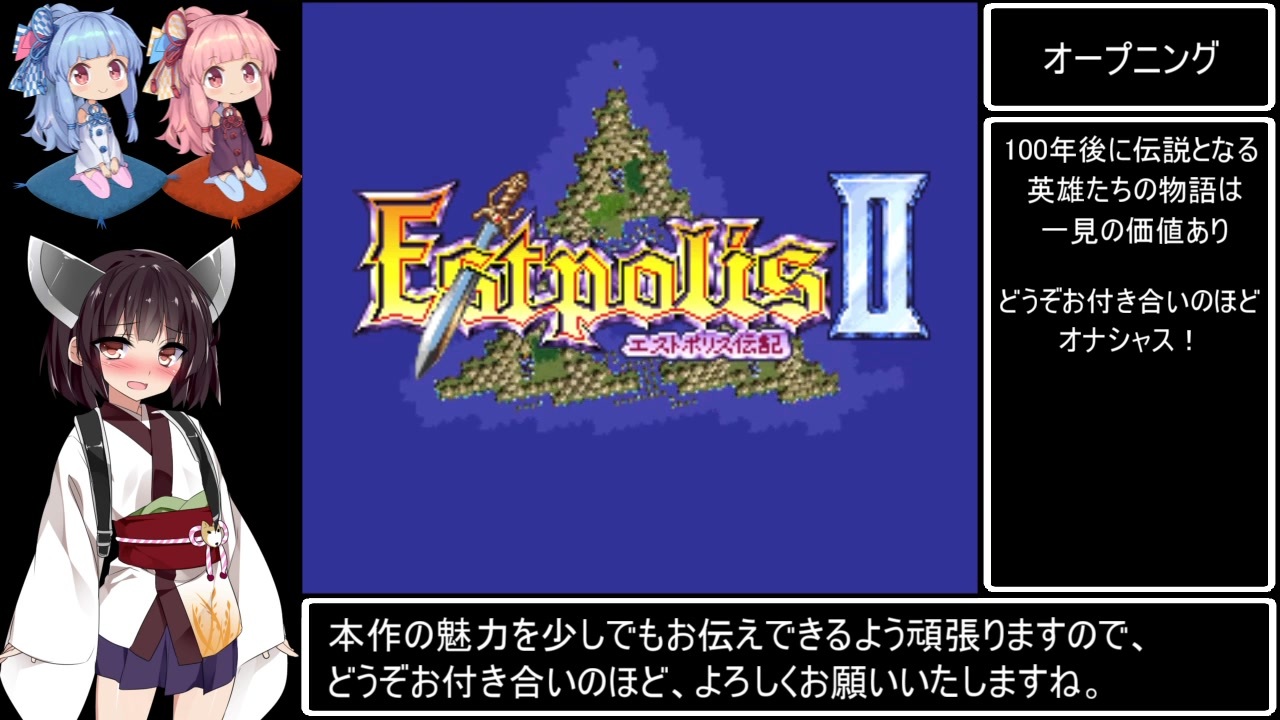 100年後に伝説となる英雄たちの物語なので初投稿です。 <br>今回は敗北イベント突破チャートを走ります。<br><br>お世話になった攻略サイト様<br> <a href="https://rrpg.jp/estpolis_2/" target="_blank" rel="noopener nofollow">https://rrpg.jp/estpolis_2/</a><br> <a href="https://w.atwiki.jp/sansara_naga2_sfc/pages/12.html" target="_blank" rel="noopener nofollow">https://w.atwiki.jp/sansara_naga2_sfc/pages/12.html</a><br><br>偉大な先駆者兄貴様 :<a href="https://www.nicovideo.jp/watch/sm24180563" class="watch">sm24180563</a><br><br>マイリスト:<a href="https://www.nicovideo.jp/mylist/73257360" target="_blank" rel="noopener">mylist/73257360</a> <br><br><br>前作:<a href="https://www.nicovideo.jp/watch/sm44786754" class="watch">sm44786754</a><br>次回:<a href="https://www.nicovideo.jp/watch/sm44985806" class="watch">sm44985806</a><br><br><a target="_blank" href="https://qa.nicovideo.jp/faq/show/19424?site_domain=default" style="font-size: 13px;color: #657586; text-decoration: underline; line-height: 1.4">この動画は投稿者によって修正されました</a>