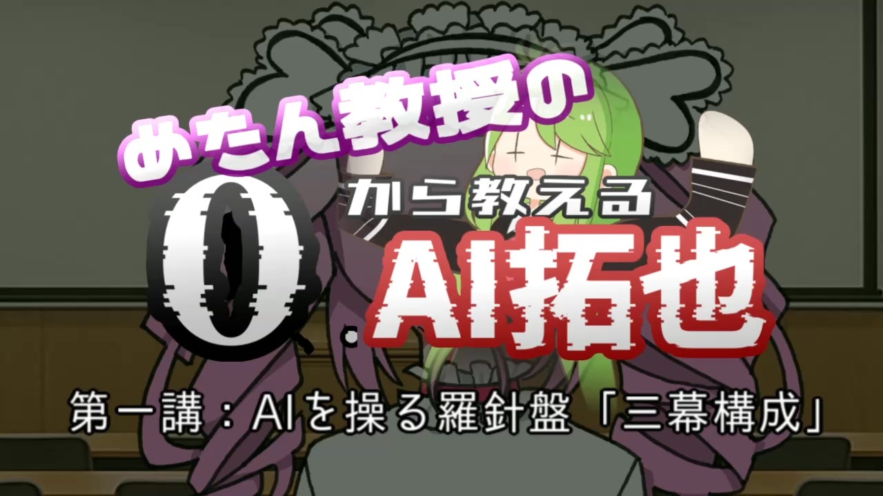 学部・大学院区分 文学部<br>時間割コード 093150 <br>科目名 AI拓也演習Ⅰ <br>担当教員 四国めたん <br>単位数 3.000 <br>対象学年 2年生以上 <br>授業形態 講義 <br>授業の目的 近年発展が目覚ましいAIを用いた短編型同人拓也制作におけるその方法論について学習する。<br>講義資料 <a href="https://note.com/cofi_lover/n/nac35ac30ebce" target="_blank" rel="noopener nofollow">https://note.com/cofi_lover/n/nac35ac30ebce</a><br>前提講義 <a href="https://www.nicovideo.jp/watch/sm44876664" class="watch">sm44876664</a><br>質問フォーラム <a href="https://notebooklm.google.com/notebook/274aac0e-708d-402e-a53c-13c5de23b8fc/preview" target="_blank" rel="noopener nofollow">https://notebooklm.google.com/notebook/274aac0e-708d-402e-a53c-13c5de23b8fc/preview</a><br><br><a target="_blank" href="https://qa.nicovideo.jp/faq/show/19424?site_domain=default" style="font-size: 13px;color: #657586; text-decoration: underline; line-height: 1.4">この動画は投稿者によって修正されました</a>