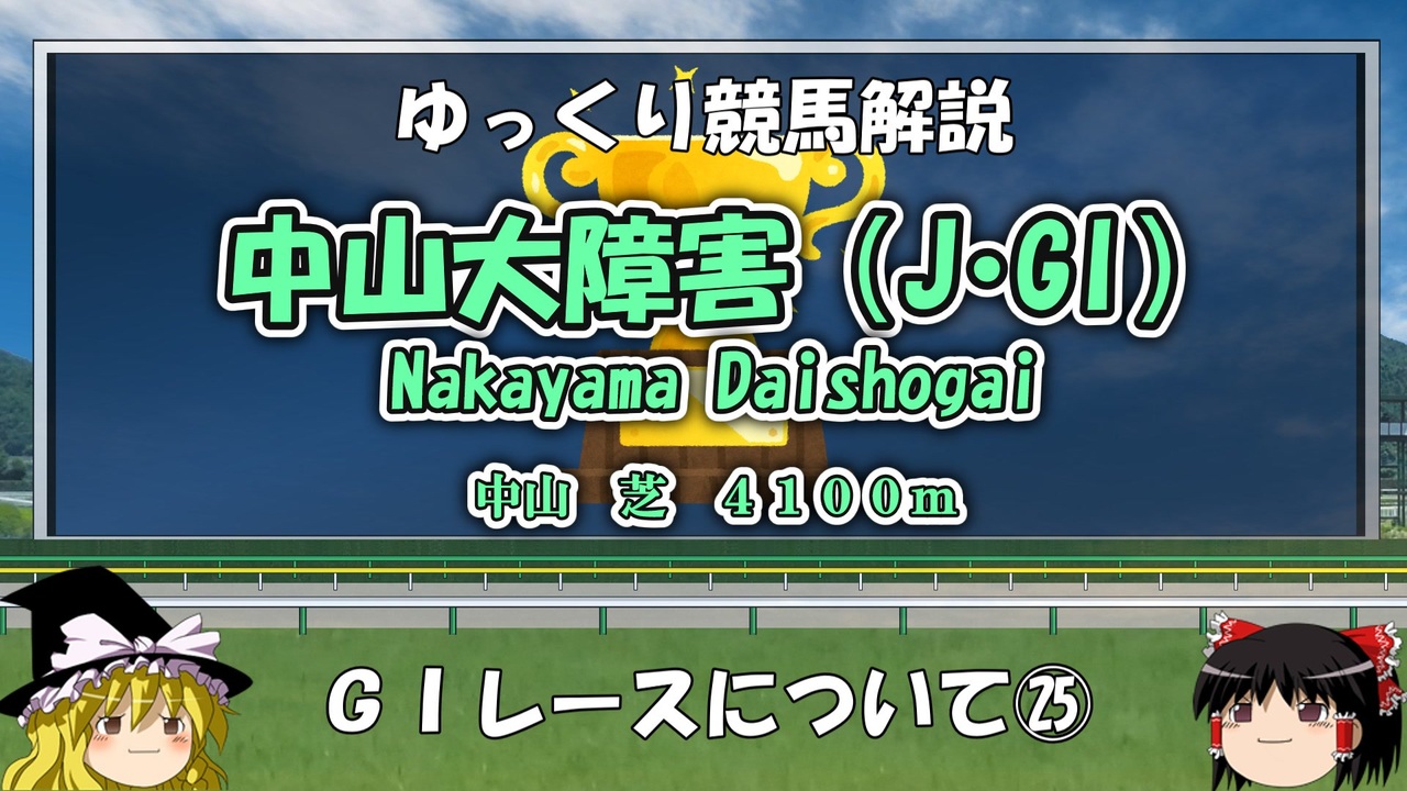前作<a href="https://www.nicovideo.jp/watch/sm45659044" class="watch">sm45659044</a> 次作 牝馬シリーズマイリス<a href="https://www.nicovideo.jp/mylist/65869255" target="_blank" rel="noopener">mylist/65869255</a> 競馬解説マイリス<a href="https://www.nicovideo.jp/mylist/64207040" target="_blank" rel="noopener">mylist/64207040</a> <br><br>つべ<a href="https://youtu.be/k2Y_xAQU3LU" target="_blank" rel="noopener nofollow">https://youtu.be/k2Y_xAQU3LU</a><br><br>競馬解説シリーズGIレース解説です。<br>今回から番外編で障害GIやっていきます!<br>GI各レースのデータ、歴史などを浅めながら紹介していきます。<br>データはGI昇格以降、2024年現在までのものを参考にしています。<br>あくまで個人で調べた範囲ですので、いつも通り間違っている可能性がありますのでご了承くださいm(__)m<br><br><br>BGM:甘茶の音楽工房様<br>画像提供元: 競馬場コース図・うまぽっと様 各種イラスト・いらすとや様 きつねゆっくり様 ニコニコモンズ様 効果音ラボ様 <br>参考HP:優駿達の蹄跡様 netkeiba.com Wikipedia JRA