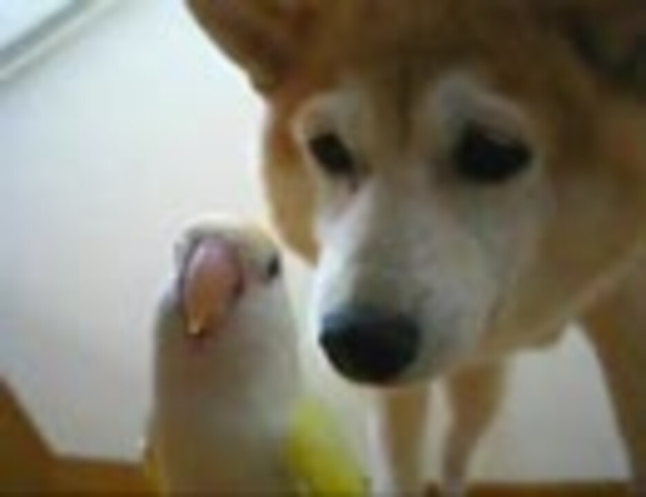 黄色いおばぁちゃんのクリ(コザクラインコ12歳)に、茶色いおばちゃん(柴犬りょう11歳)を添えて。後半は、ルリベニ・ローズ&りょうのバナナ祭りです。