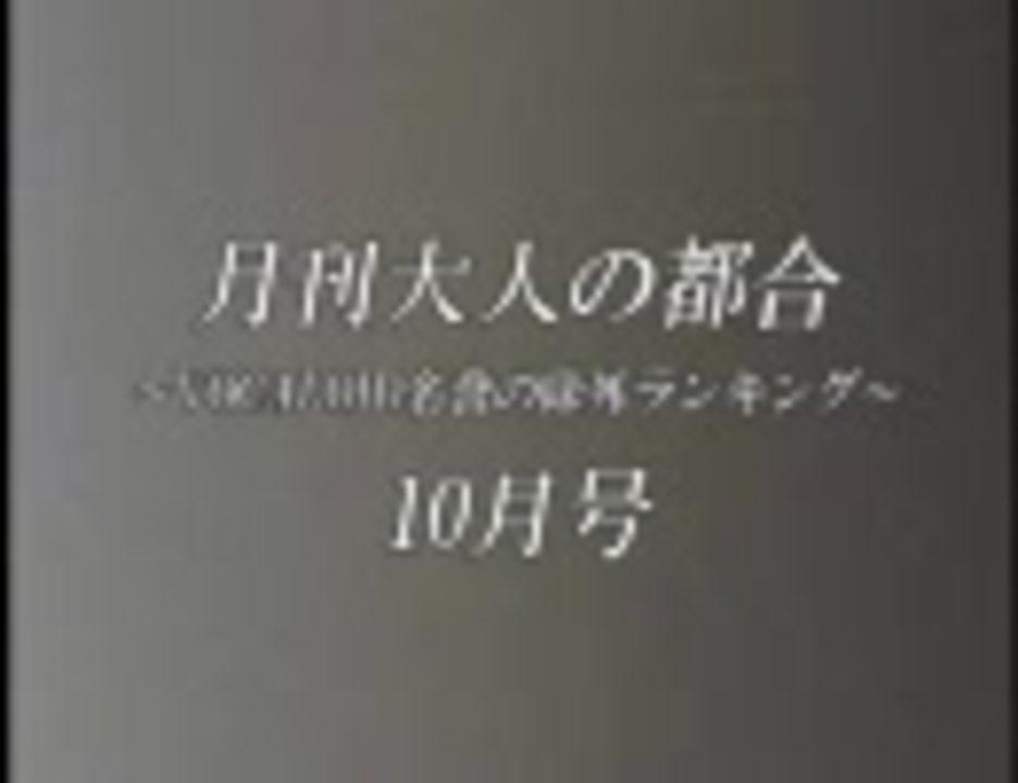 <font color=red>この動画を不快に感じそうでしたら、移動するかウインドウを閉じることを推奨します。</font><br /><br />○集計対象:#48~#52までの「週刊VOCALOIDランキング」の<br />「大人の都合→名誉のランキング除外」曲。<br />○集計方法:除外された回のポイントを合計。計算方法は週刊ぼからんと同じ。<br /><br />10月号の曲リスト:(公開終了しました。大百科記事をお待ちください) 全除外リスト:<a href="https://www.nicovideo.jp/mylist/7127041" target="_blank" rel="noopener">mylist/7127041</a><br /><br />#38までの通算ランキング:<a href="https://www.nicovideo.jp/watch/sm3754162" class="watch">sm3754162</a> | 11月号:<a href="https://www.nicovideo.jp/watch/sm5109065" class="watch">sm5109065</a> バックナンバー:<a href="https://www.nicovideo.jp/mylist/10229218" target="_blank" rel="noopener">mylist/10229218</a><br />ニコ割ムービーでのジャンプに暫定対応中
