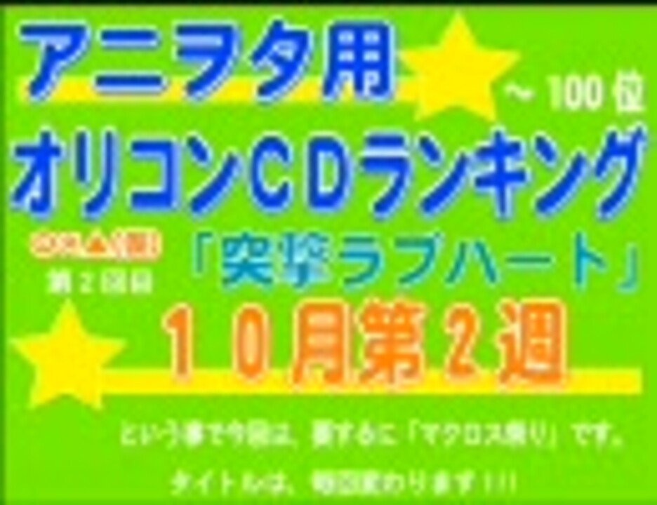 10月第2週のランキングです。今回シングル上位が無かったので、アルバムランキングをやりました。オリコンシングルは、上位はるか先ですから、表示してません・・・ アルバムはというと、1位との差は304,441枚で僅差?でした。たまには、1位とってほしいですね!!! 今回も、大記録がありましたので、MADで発表しています! それではお楽しみ下さいませ。 101~:<a href="https://www.nicovideo.jp/watch/sm4954119" class="watch">sm4954119</a> コミックランキング(先週分):<a href="https://www.nicovideo.jp/watch/nm4973806" class="watch">nm4973806</a>(<a href="https://www.nicovideo.jp/watch/nm4894434" class="watch">nm4894434</a>) 過去ランキング:準備中 曲の説明&アンケートうp:<a href="https://www.nicovideo.jp/watch/sm4957528" class="watch">sm4957528</a> ブログにもご意見くださいね <a href="http://5016190.cocolog-nifty.com/blog/" target="_blank" rel="noopener nofollow">http://5016190.cocolog-nifty.com/blog/</a>