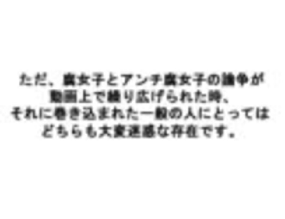 この動画を作った人も腐女子です。現在絶賛大暴れ中の暴徒と化した一部腐女子の皆さんへ言いたいことを全部詰め込んだらとんでもなく長くなったので、いくつかテーマごとに分割したものも作りました。順序の変更・内容の重複も多少あります。気になる部分だけ見たい時にどうぞ。→<a href="https://www.nicovideo.jp/mylist/1748219" target="_blank" rel="noopener">mylist/1748219</a> 他の方が作った簡潔でわかりやすいこちらの動画もぜひどうぞ→<a href="https://www.nicovideo.jp/watch/sm443666" class="watch">sm443666</a> 追記:動画の性質上、騒ぐ『腐女子』の皆さんがよく使われる表現だったので例として『キモヲタ』を用いました。が、あまり良い使い方ではなかったと思います。気分を害された方にはお詫び申し上げます。すみませんでした。