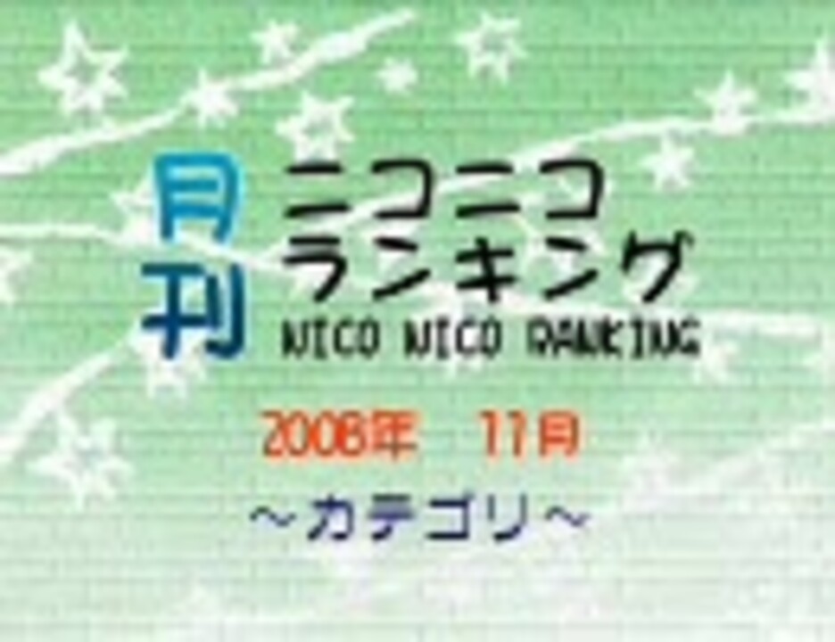 ★別名:ゲッダンニコニコランキング<br />★集計期間:11月1日5時~12月1日5時<br />★集計対象:全カテゴリ各100位(ランク外は0ポイント扱い)<br />★集計方法<br />動画ポイント:再生数+コメント数×補正値+マイリスト登録数×20<br />カテゴリポイント:カテゴリ所属動画の動画ポイントの合計<br /><br />★紹介動画へのリンクはこちらから→公開終了しました。↓からどうぞ。<br />★全集計結果一覧はこちらからどうぞ→<a href="http://www39.atwiki.jp/niconicoranking/" target="_blank" rel="noopener nofollow">http://www39.atwiki.jp/niconicoranking/</a><br />★@カテゴリ2008年10月→<a href="https://www.nicovideo.jp/watch/sm5202509" class="watch">sm5202509</a> カテラン2008年12月→12日頃<br />★2008年11月総合→<a href="https://www.nicovideo.jp/watch/sm5480886" class="watch">sm5480886</a><br /><br />★申し訳ありません。テスト1位の情報の更新を忘れていました。正しくは<b>78,233 point 再 1位:73,345 コ 28位:2,068(補正値:1.00) マ 7位:141</b>となります。