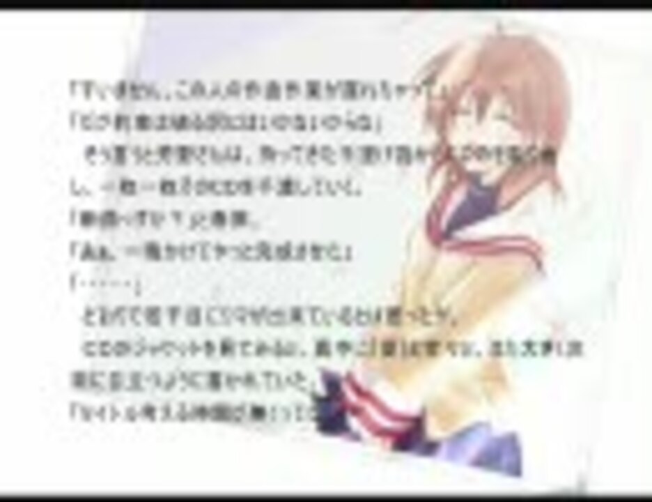 という事で、完成品です。<br />未完成版より時間が2倍となりました……w<br />お暇なときにでも、お読みください(´、ゝ`)ノシ<br /><br /><font color=red>【3/14】新作完成品版うp!→[<a href="https://www.nicovideo.jp/watch/sm6420423" class="watch">sm6420423</a>]</font><br />○マリカーWiiマイリスト:<a href="https://www.nicovideo.jp/mylist/10665491" target="_blank" rel="noopener">mylist/10665491</a><br />○ショートストーリーマイリスト:<a href="https://www.nicovideo.jp/mylist/10854711" target="_blank" rel="noopener">mylist/10854711</a><br />○ブログ:<a href="http://blogerplan.blog75.fc2.com/" target="_blank" rel="noopener nofollow">http://blogerplan.blog75.fc2.com/</a><br /><br /><font color=red>「汐」とコメントすると……?<br />「だんご」とコメントすると……?</font>