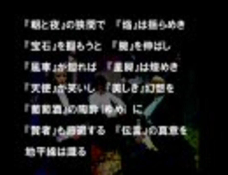 朝と夜の物語、高音質、歌詞ありVer.です(低音質版はこちら→<a href="https://www.nicovideo.jp/watch/sm666657" class="watch">sm666657</a>)。<br /><br />歌詞が間違ってるところが数カ所あるようです。確認不足で申し訳ない。<br /><br />MIDIです→<a href="http://www.geocities.jp/asayorumidi/asayoru.zip" target="_blank" rel="noopener nofollow">http://www.geocities.jp/asayorumidi/asayoru.zip</a><br /><br />べ、べつに、あんたたちのために再うpしたわけじゃないんだからね!<br />消えないようにわざわざジオに上げたけど、<br />たまたま垢持ってたからそうしただけなんだから!勘違いしないでよね!<br /><br />他の作品→<a href="https://www.nicovideo.jp/mylist/1583319" target="_blank" rel="noopener">mylist/1583319</a><br /><font size="5">夏コミ当選!!!</font><br />8/13(二日目) 東イ-57bです。<br />けいおん!ビッグバンドジャズアレンジアルバム「じゃずけん!」を頒布します。<br />詳細はこちら↓<br />[Data by Ton2]<br /><a href="http://www.geocities.jp/asayorumidi/" target="_blank" rel="noopener nofollow">http://www.geocities.jp/asayorumidi/</a>