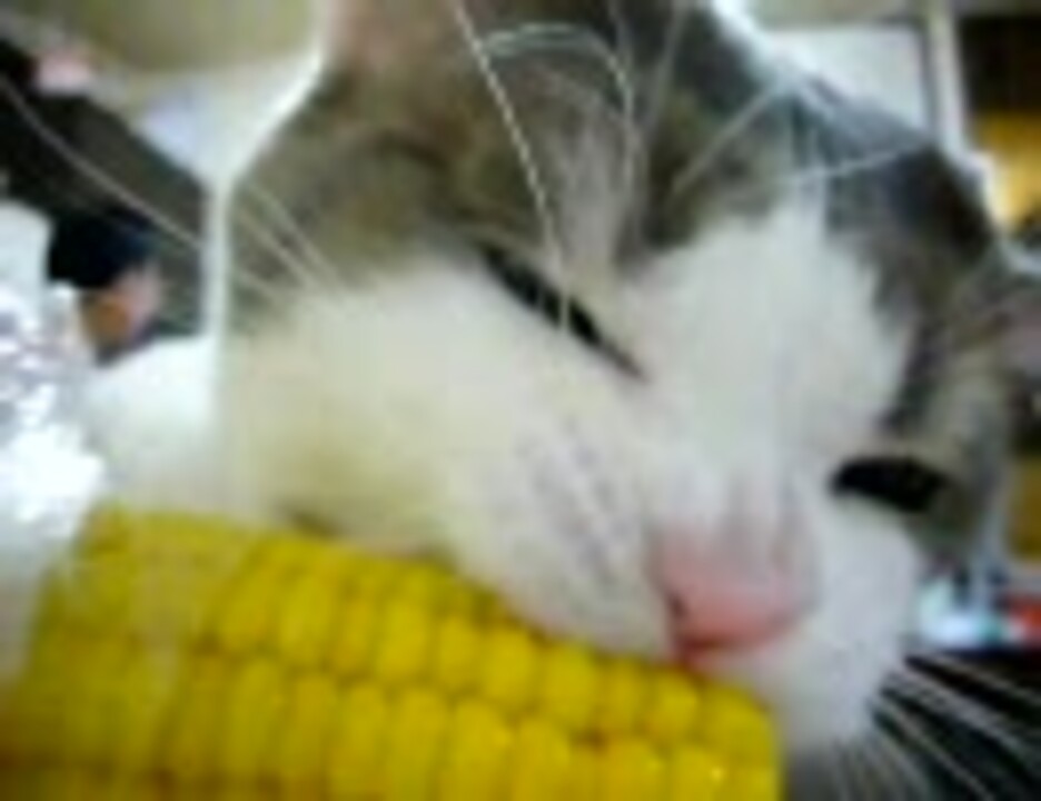 トウモロコシを齧る猫