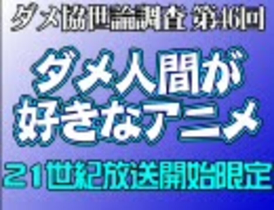 ダメ人間生活協同組合(<a href="http://homepage1.nifty.com/ima-dame/)のアンケート" target="_blank" rel="noopener nofollow">http://homepage1.nifty.com/ima-dame/)のアンケート</a><br />第46回ダメ人間世論調査より (21世紀放送開始限定版)ダメ人間はどのアニメを選ぶ?<br /><br />ダメ協世論調査リスト:<a href="https://www.nicovideo.jp/mylist/9057157" target="_blank" rel="noopener">mylist/9057157</a> 自作旅動画一覧:<a href="https://www.nicovideo.jp/mylist/8039032" target="_blank" rel="noopener">mylist/8039032</a><br />自作ダメ動画一覧:<a href="https://www.nicovideo.jp/mylist/4669671" target="_blank" rel="noopener">mylist/4669671</a> 自作車系動画:<a href="https://www.nicovideo.jp/mylist/8855472" target="_blank" rel="noopener">mylist/8855472</a><br />その他自作動画:<a href="https://www.nicovideo.jp/user/576589/video" target="_blank" rel="noopener">myvideo/576589</a>