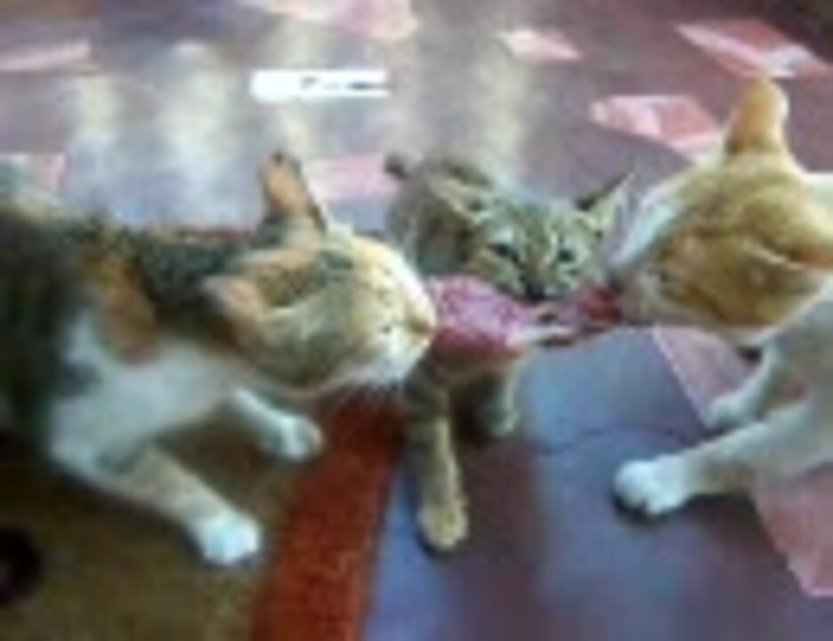 三匹の猫が肉の奪い合い