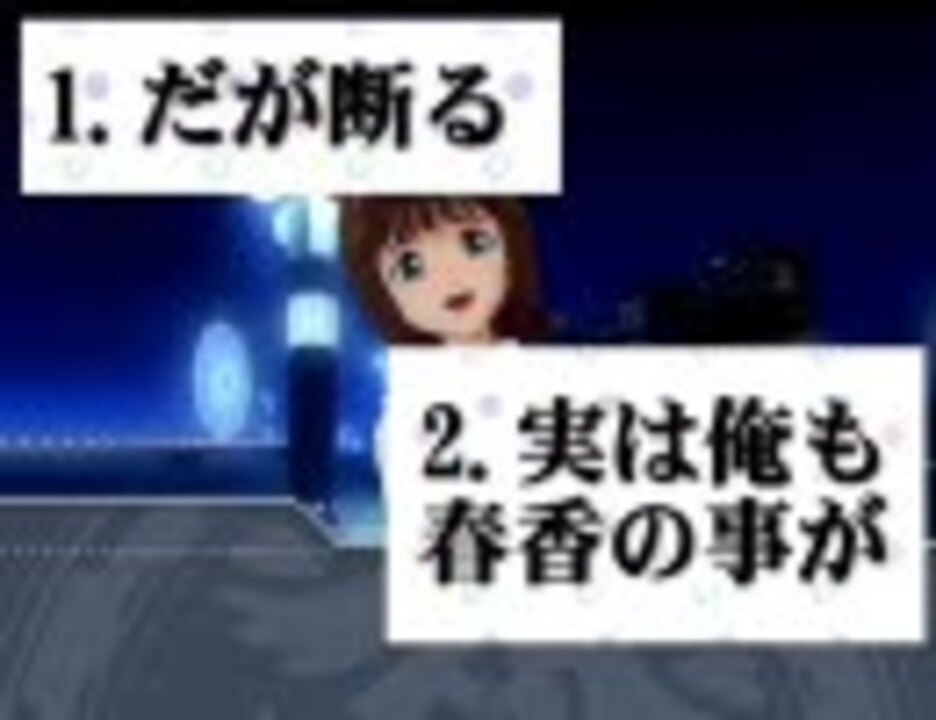 新作(2/3)→<a href="https://www.nicovideo.jp/watch/sm9589572" class="watch">sm9589572</a><br />ニワン語でP名入力と動画内分岐を実装してみました。<br />コメントで打った文字列が、P名として画面上に表示されます。<br />ギャルゲ(ときメモ)ということで、エロゲm@sterにも便乗させてくだちい。<br />春香のドーム成功EDのネタバレを含みます。<br /><br />※歪様の立ち絵、すいぎんP様の紙芝居クリエーター、架空戦記ろだスレの素材を使わせていただいています。<br />※<a href="https://www.nicovideo.jp/mylist/13386257" target="_blank" rel="noopener">mylist/13386257</a><br />※ニコ動の仕様で同じコメントは連続して打てないので、再プレイ時に同じP名を使う場合は、一度別のコメントを打ってください。<br /><font color=red>(12/13追記) エコノミーモードだとジャンプ先がずれるようです。空いてる時に見てください。すまん。</font>