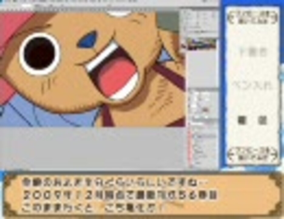 はじめまして、Chihuahua(チワワ)と申します。_____今回、甥っ子達にワンピースの年賀状を描いて贈ったので、その記念に動画にしてみました。_____「描いてみた」と言う割りには、編集されまくりだったり、日記みたいな蛇足がついてたりと、わけのわからない動画になってますが、ゆる~く見てやってください。【追記】うぉー!初のコメント3桁突破(笑)ありがとうございます!後日談として、甥っ子達から電話でお便りを頂き、喜んで貰えたみたいで大変うれしかったです。一緒に贈った塗り絵も縫って貰えたそうでよかったよかった!_____自己満足な再編集版動画はこちら<a href="https://www.nicovideo.jp/watch/sm9457558" class="watch">sm9457558</a>【落書き注意】
