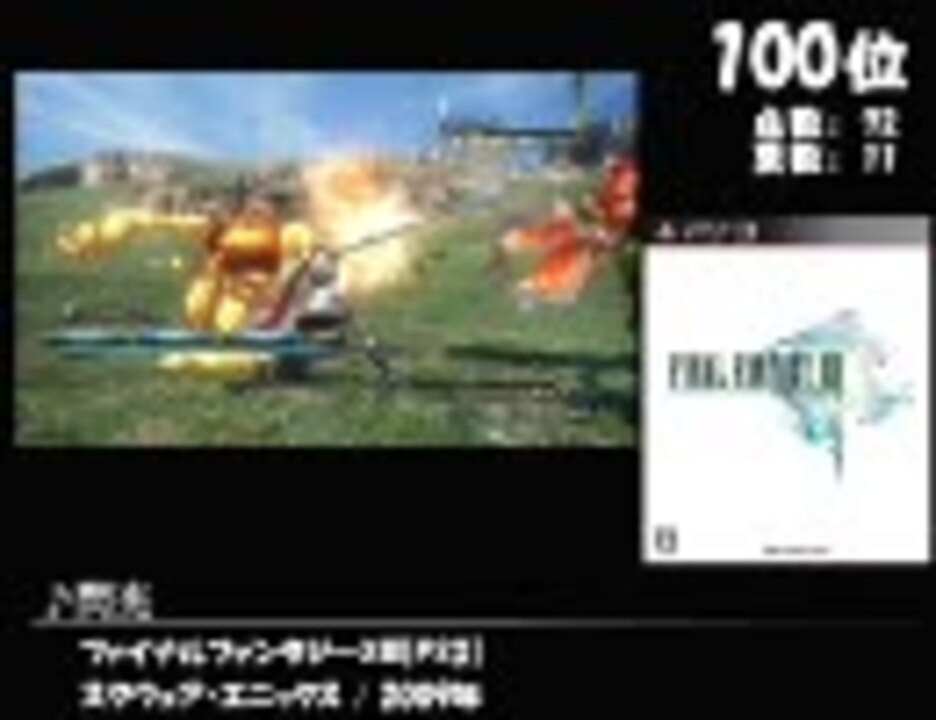 ベスト100に突入です。<br />Part16→<a href="https://www.nicovideo.jp/watch/sm9571921" class="watch">sm9571921</a> 第3回まとめ→<a href="https://www.nicovideo.jp/mylist/15684223" target="_blank" rel="noopener">mylist/15684223</a> Part18→<a href="https://www.nicovideo.jp/watch/sm9788496" class="watch">sm9788496</a> <br /><font size="-5" color="white">【収録タイトル】ペルソナ3 ファイナルファンタジー5・10・13 スターオーシャン2 ICO カラス ドラゴンクエスト2・3 ルドラの秘宝 英雄伝説空の軌跡SC ナイトストライカー エースコンバット6 聖剣伝説LOM この青空に約束を 星のカービィSDX 爆ボンバーマン2 428 スーパードンキーコング イースフェルガナの誓い ポポロクロイス物語 マリオ&ルイージRPG3 ママトト サガフロンティア クロノトリガー</font>