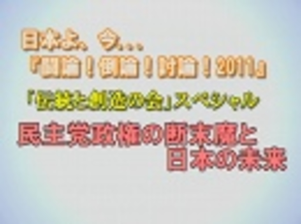 ◆伝統と創造の会スペシャル・民主党政権の断末魔と日本の未来<br><br>出演:<br> 赤池誠章(前衆議院議員・「伝統と創造の会」事務局長)<br> 稲田朋美(衆議院議員・「伝統と創造の会」会長)<br> 宇都隆史(参議院議員・「伝統と創造の会」幹事)<br> 大塚拓(前衆議院議員・「伝統と創造の会」幹事)<br> 岡崎久彦(NPO法人岡崎研究所理事長・元駐タイ大使)<br> 木原稔(前衆議院議員・「伝統と創造の会」幹事)<br> 薗浦健太郎(前衆議院議員・「伝統と創造の会」幹事長)<br> 西田昌司(参議院議員・「伝統と創造の会」幹事)<br> 林潤(前衆議院議員・「伝統と創造の会」副幹事長)<br> 松本洋平(前衆議院議員・「伝統と創造の会」事務局次長)<br> 谷内正太郎(外務省顧問・元外務事務次官)<br>司会:水島総<br><br> ①<a href="https://www.nicovideo.jp/watch/1314350723" class="watch">watch/1314350723</a><br> ②<a href="https://www.nicovideo.jp/watch/1314350496" class="watch">watch/1314350496</a><br> ③<a href="https://www.nicovideo.jp/watch/1314350299" class="watch">watch/1314350299</a><br><br>◆チャンネル桜公式HP<br><a href="http://www.ch-sakura.jp/" target="_blank" rel="noopener nofollow">http://www.ch-sakura.jp/</a>