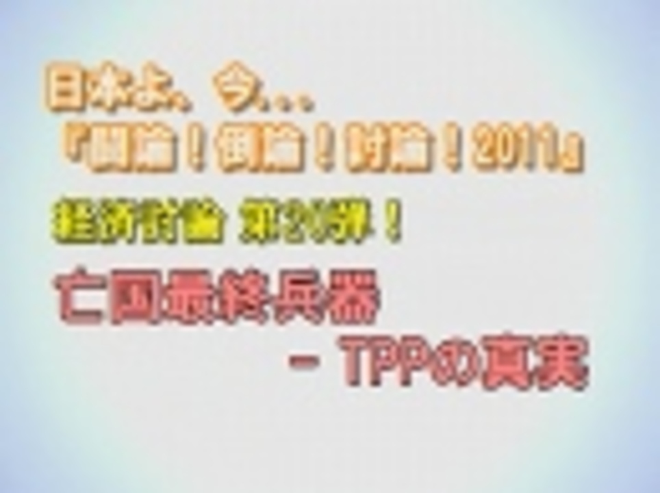 ◆経済討論 第20弾!亡国最終兵器 TPPの真実<br><br>パネリスト:<br> 井尻千男(拓殖大学名誉教授)<br> 片桐勇治(元国民新党広報部長)<br> 関岡英之(ノンフィクション作家)<br> 東谷暁(ジャーナリスト)<br> 藤井聡(京都大学大学院教授)<br> 三橋貴明(経済評論家・作家)<br> 山田俊男(参議院議員)<br>司会:水島総 <br><br> ①<a href="https://www.nicovideo.jp/watch/1320438210" class="watch">watch/1320438210</a><br> ②<a href="https://www.nicovideo.jp/watch/1320437878" class="watch">watch/1320437878</a><br> ③<a href="https://www.nicovideo.jp/watch/1320437651" class="watch">watch/1320437651</a><br><br>※チャンネル桜では、自由且つ独立不羈の放送を守るため、『日本文化チャンネル桜二千人委員会』の会員を募集しております。以下のページでご案内申し上げておりますので、全国草莽の皆様のご理解、ご協力を、何卒宜しくお願い申し上げます。<br><a href="http://www.ch-sakura.jp/topix/538.html" target="_blank" rel="noopener nofollow">http://www.ch-sakura.jp/topix/538.html</a><br><br>◆チャンネル桜公式HP<br><a href="http://www.ch-sakura.jp/" target="_blank" rel="noopener nofollow">http://www.ch-sakura.jp/</a>
