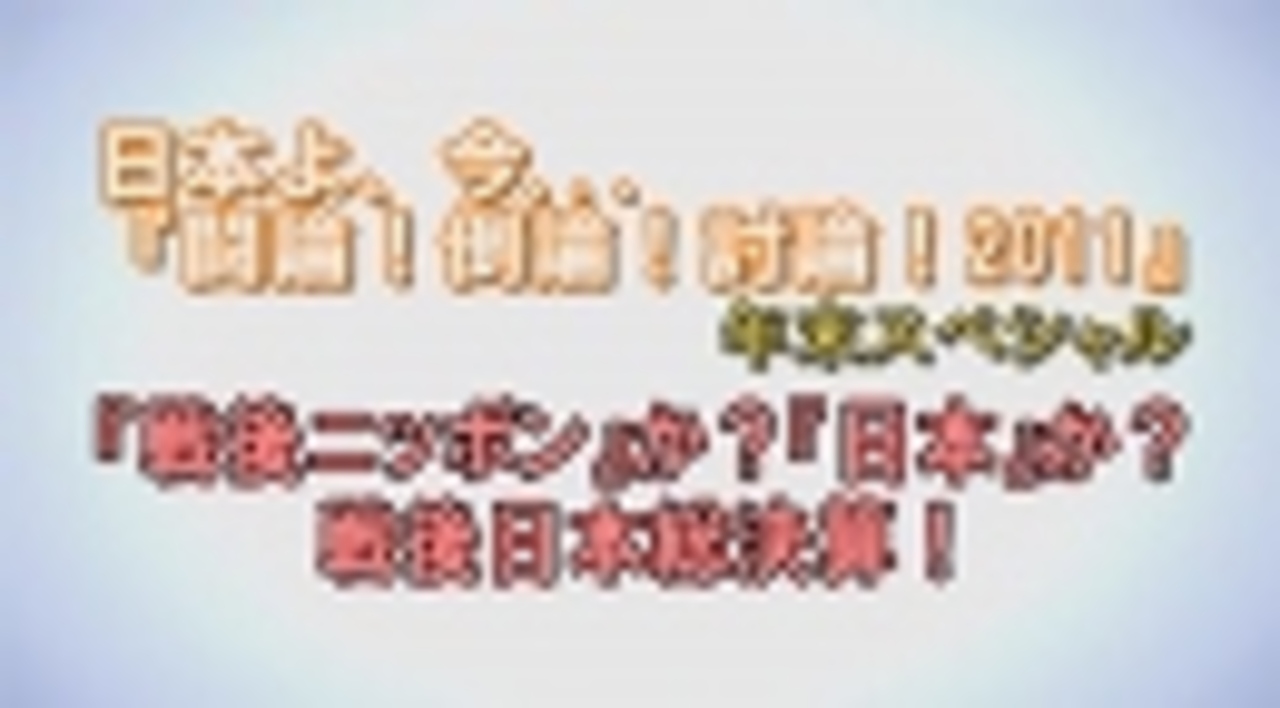 ◆2011 年末スペシャル - 「戦後ニッポン」か?「日本」か?戦後日本総決算!<br><br>パネリスト:<br> 一色正春(元海上保安官)<br> 潮匡人(評論家)<br> 日下公人(評論家・社会貢献支援財団会長)<br> 高山正之(ジャーナリスト)<br> 中野剛志(京都大学大学院準教授)<br> 増元照明(「家族会」事務局長)<br> 松原好之(作家・神奈川歯科大学客員教授・「進学塾ビッグバン」主宰者)<br> 山村明義(作家・ジャーナリスト)<br>司会:水島総<br><br> ①<a href="https://www.nicovideo.jp/watch/1325158752" class="watch">watch/1325158752</a><br> ②<a href="https://www.nicovideo.jp/watch/1325158419" class="watch">watch/1325158419</a><br> ③<a href="https://www.nicovideo.jp/watch/1325158138" class="watch">watch/1325158138</a><br><br>※チャンネル桜では、自由且つ独立不羈の放送を守るため、『日本文化チャンネル桜二千人委員会』の会員を募集しております。以下のページでご案内申し上げておりますので、全国草莽の皆様のご理解、ご協力を、何卒宜しくお願い申し上げます。<br><a href="http://www.ch-sakura.jp/topix/538.html" target="_blank" rel="noopener nofollow">http://www.ch-sakura.jp/topix/538.html</a><br><br>◆チャンネル桜公式HP<br><a href="http://www.ch-sakura.jp/" target="_blank" rel="noopener nofollow">http://www.ch-sakura.jp/</a>