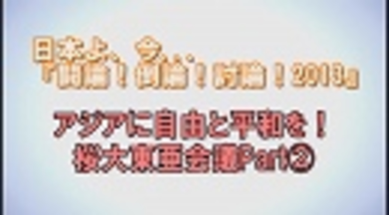 ◆アジアに自由と平和を!桜大東亜会議Part2<br><br>パネリスト:<br> アウ・ミン・ユン(「ベトナム革新党」日本支部長)<br> イリハム・マハムティ(世界ウイグル会議 東アジア地区副総裁・日本ウイグル協会代表)<br> オルホノド・ダイチン(「モンゴル自由連盟党」代表)<br> 黄文雄(作家・評論家)<br> 石平(評論家)<br> ペマ・ギャルポ(桐蔭横浜大学大学院教授・チベット文化研究所名誉所長)<br> 鳴霞(月刊「中国」編集長)<br>司会:水島総<br><br> ①<a href="https://www.nicovideo.jp/watch/1383352628" class="watch">watch/1383352628</a><br> ②<a href="https://www.nicovideo.jp/watch/1383353021" class="watch">watch/1383353021</a><br> ③<a href="https://www.nicovideo.jp/watch/1383353436" class="watch">watch/1383353436</a><br><br>※チャンネル桜では、自由且つ独立不羈の放送を守るため、『日本文化チャンネル桜二千人委員会』の会員を募集しております。以下のページでご案内申し上げておりますので、全国草莽の皆様のご理解、ご協力を、何卒宜しくお願い申し上げます。<br><a href="http://www.ch-sakura.jp/579.html" target="_blank" rel="noopener nofollow">http://www.ch-sakura.jp/579.html</a><br><br>◆チャンネル桜公式HP<br><a href="http://www.ch-sakura.jp/" target="_blank" rel="noopener nofollow">http://www.ch-sakura.jp/</a>