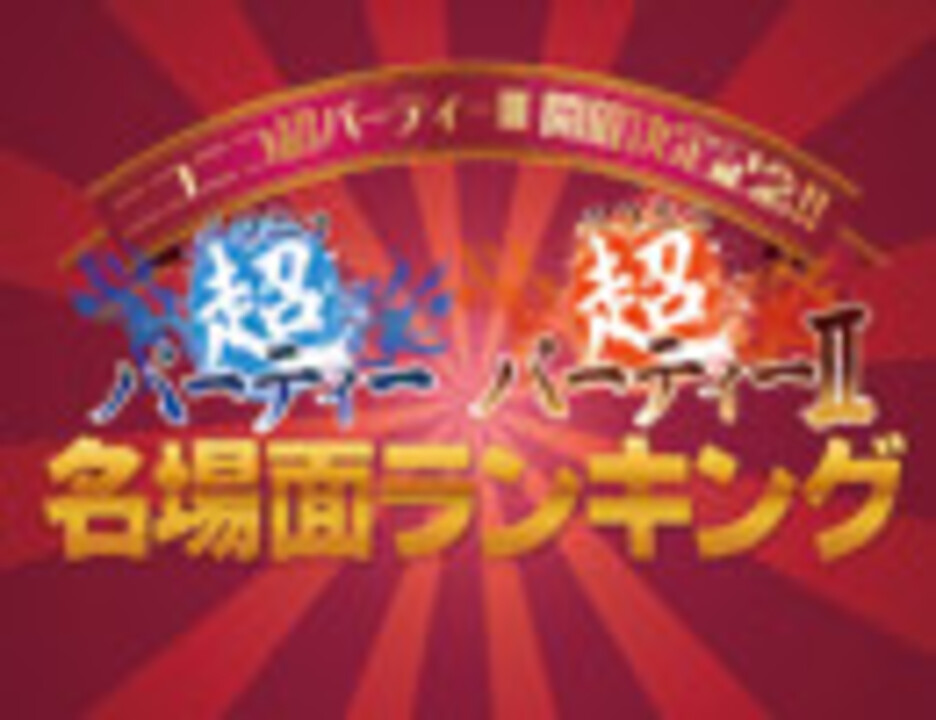 ニコニコ超パーティー2016開催!<br>開催日:2016年11月3日(木・祝)<br>場所:さいたまスーパーアリーナ<br><br>リアルチケット:<br>S席 6800円(ライブステージ:全席指定・ゲーム実況ステージ:自由席)<br><br>ネットチケット:現在 2000pt<br>早く買うほどお得!<br><br>チケット詳細、内容についてはニコニコ超パーティー2016特設サイトをチェック!<br><a href="http://choparty.jp/">http://choparty.jp/</a><br><br><br>■様々なカテゴリから構成される超パーティー。<br>ニコニコ超パーティーⅠ&Ⅱの数々の名場面から選りすぐりの40選をランキング形式でご紹介!<br><br>超パーティー2016ではどのような名場面が生まれるのか!お楽しみに!<br><br>