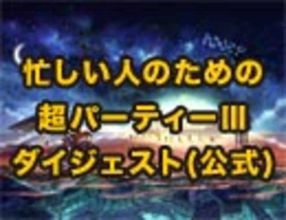 ニコニコ超パーティー2016開催!<br>開催日:2016年11月3日(木・祝)<br>場所:さいたまスーパーアリーナ<br><br>リアルチケット:<br>6800円(ライブステージ:全席指定・ゲーム実況ステージ:自由席)<br><br>ネットチケット:現在 2000pt<br>早く買うほどお得!<br><br>チケット詳細、内容についてはニコニコ超パーティー2016特設サイトをチェック!<br><a href="http://choparty.jp/">http://choparty.jp/</a><br><br><br>■2014年4月26/27日に幕張メッセイベントホールにて開催された<br>ニコニコ超パーティーⅢin超会議3 の約10時間を忙しいあなたのために24分36秒でお届けします!<br><br>※一部、意向により省かせて頂いている演目がございます<br><br>