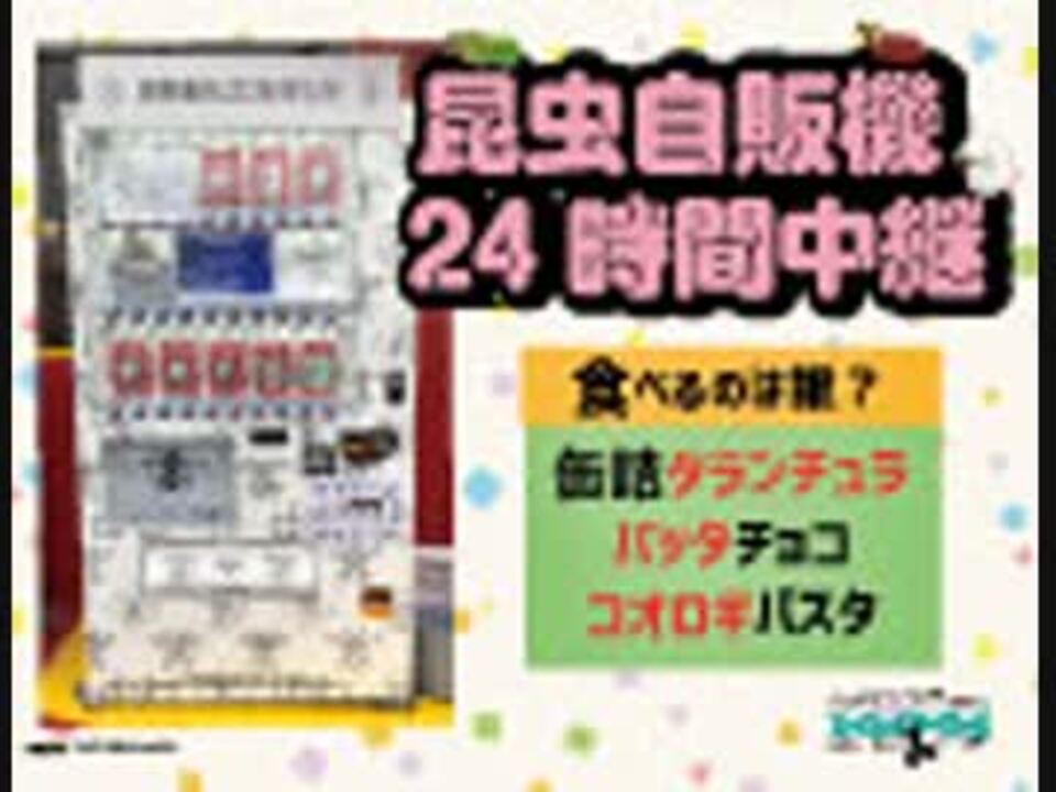 <br>こちらは、3月3日の夜8時より生放送でお届けした、<br><br>"【昆虫自販機 24時間中継】<br>缶詰タランチュラ、バッタチョコ、コオロギパスタを誰が買うのか?"<br><br>という番組のダイジェスト版になります。<br><br>日曜日の夜8時から、月曜日の夜8時までの24時間。<br>そんな時間に、昆虫食を自販機まで買いに来る人などいるのだろうか…?<br>少し不安な気持ちで生中継はスタートしました。<br><br>この日曜日の夜はあいにくの雨で、<br>なかなか購入者が現れず、<br>傘を叩く雨音を聞きながら、<br>「普通に考えて、生中継するなら、もっと別の時間がよかったのでは?」<br>と思っていた矢先、<br>最初の勇者(購入者)が現れたのでした。<br>そこからの盛り上がりを、ぜひ動画で確認いただければと思います。<br><br>他では聞けない「昆虫食の食レポ」だけあって、<br>まさに「勇者ホイホイ」、そして「名言ホイホイ」状態に。<br><br>勇者がゲンゴロウをかじり、膝から崩れ落ちる瞬間を、お見逃しなく。<br><br><br>番組放送時の盛り上がりは、<a href="https://live2.nicovideo.jp/watch/lv318605542" target="_blank">こちら</a>からご覧いただけます。<br><br><br>▼関連番組▼<br><br>・<a href="https://live2.nicovideo.jp/watch/lv318605591" target="_blank">今夜のおかずに昆虫料理〜昆虫食研究家とシェフが美味しいレシピを教えます〜</a><br><br>・<a href="https://live2.nicovideo.jp/watch/lv318605565" target="_blank">写真で見る美味しい昆虫料理50選 〜イナゴのかき揚げ、コオロギピザ、ミールワームの茶碗蒸し〜</a><br><br>・<a href="https://live2.nicovideo.jp/watch/lv318605400" target="_blank">食の大革命「バイオフード:芽生えつつある昆虫食と都市農業」</a><br><br>・<a href="https://live2.nicovideo.jp/watch/lv318605360" target="_blank">食の大革命「フードテックバブル:シリコンバレーで生まれる培養肉」</a><br><br>・<a href="https://live2.nicovideo.jp/watch/lv318605434" target="_blank">食の大革命「ゲノムフード:遺伝子編集肉とクローン牛工場」</a><br>