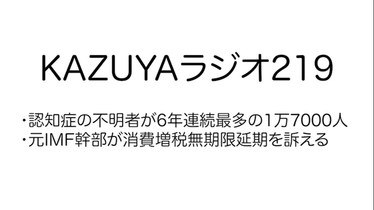 ・認知症の不明者が6年連続最多の1万7000人<br>・元IMF幹部が消費増税無期限延期を訴える<br><br>ラジオ配信マイリス→<a href="http://www.nicovideo.jp/mylist/62519500" target="_blank" rel="noopener nofollow">http://www.nicovideo.jp/mylist/62519500</a><br>KAZUYA→<a href="https://twitter.com/kazuyahkd2" target="_blank" rel="noopener nofollow">https://twitter.com/kazuyahkd2</a><br>和田→<a href="https://twitter.com/media_otb" target="_blank" rel="noopener nofollow">https://twitter.com/media_otb</a>