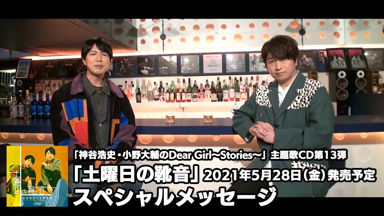 神谷浩史・小野大輔のDear Girl~Stories~」主題歌第13弾が5月28日に発売決定!<br>スペシャルメッセージを公開!<br><br>収録楽曲は2021年4月からオンエア中の新OP曲「土曜日の靴音」と新ED曲「WE ARE OPEN」、<br>そして番組発のエアバンドMASOCHISTIC ONO BAND 改め MASOCHISTIC BONO BAND(MBB)が担当する<br>TVアニメ『ぼのぼの』新主題歌「ぼのぼのロックンロール」のフルサイズバージョンを収録。<br>それぞれのオフボーカルバージョンを含んだ全6トラック仕様です。<br>初回生産分のみ「ぼのぼの」風にMBBメンバーが描かれた「ぼのぼのロックンロール」CDジャケット風アナザージャケット封入。<br><br><br>収録楽曲:<br>01.土曜日の靴音<br>02.WE ARE OPEN<br>03.ぼのぼのロックンロール<br>04.土曜日の靴音(off vocal)<br>05.WE ARE OPEN(off vocal)<br>06.ぼのぼのロックンロール(off vocal)<br><br><br>[ 商品情報 ]<br>発売日:2021年5月28日(金)予定<br>価格:1,650円(税込)<br><br>[ 販売 ]<br>アニメイト特典:B2ポスター<br> <a href="https://www.animate-onlineshop.jp/pn/pd/1920107/" target="_blank" rel="noopener nofollow">https://www.animate-onlineshop.jp/pn/pd/1920107/</a> <br>文化放送A&Gショップ 特典:L判ブロマイド<br><a href="https://aandg.shop-pro.jp/?pid=158558827" target="_blank" rel="noopener nofollow">https://aandg.shop-pro.jp/?pid=158558827</a><br><br><br>番組では皆さんからのお便りお待ちしています。<br><br>・放送日時<br>文化放送 毎週(土)25時〜25時30分<br>ラジオ大阪 毎週(日)23時〜23時30分<br>インターネットサイマルラジオradikoでも聴取可能です。<br><br>・公式Twitter<br><a href="https://twitter.com/uchi_P_" target="_blank" rel="noopener nofollow">https://twitter.com/uchi_P_</a><br><br>・番組メールアドレス<br>dgs@joqr.net<br><br>・番組公式サイト<br><a href="https://pc.animelo.jp/special/deargirl-stories/" target="_blank" rel="noopener nofollow">https://pc.animelo.jp/special/deargirl-stories/</a><br><br>