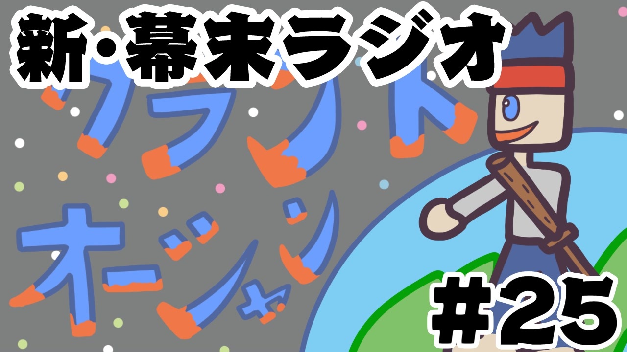 新・幕末ラジオ 2021年1月16日(月)放送分<br><br>1,中岡作ノートRPG「グランドオーシャン」:<a href="#" class="seekTime" data-seekTime="0:14" onclick="seekNicoPlayer('#0:14'); return false;">#0:14</a><br>2,放送次第:<a href="#" class="seekTime" data-seekTime="37:37" onclick="seekNicoPlayer('#37:37'); return false;">#37:37</a><br>3,幕オン2告知など:<a href="#" class="seekTime" data-seekTime="38:10" onclick="seekNicoPlayer('#38:10'); return false;">#38:10</a><br>4,妹が結婚するらしい:<a href="#" class="seekTime" data-seekTime="48:52" onclick="seekNicoPlayer('#48:52'); return false;">#48:52</a><br><br><a href="https://www.nicovideo.jp/watch/so38472023" class="watch">so38472023</a>←第24回 第26回→<a href="https://www.nicovideo.jp/watch/so38684337" class="watch">so38684337</a><br>(会員限定)新幕末ラジオマイリスト:<a href="https://www.nicovideo.jp/mylist/78814077" target="_blank" rel="noopener">mylist/78814077</a><br>(会員限定)旧幕末ラジオマイリスト:<a href="https://www.nicovideo.jp/mylist/55616469" target="_blank" rel="noopener">mylist/55616469</a><br><br>更新情報(Twitter) → <a href="https://twitter.com/kirizaki_ei" target="_blank" rel="noopener nofollow">https://twitter.com/kirizaki_ei</a><br>ゲーム実況まとめ : <a href="https://www.nicovideo.jp/mylist/8299531" target="_blank" rel="noopener">mylist/8299531</a><br>単発動画まとめ : <a href="https://www.nicovideo.jp/mylist/10539272" target="_blank" rel="noopener">mylist/10539272</a><br>生放送まとめ : <a href="https://www.nicovideo.jp/mylist/53482635" target="_blank" rel="noopener">mylist/53482635</a><br>幕末志士チャンネル : <a href="https://ch.nicovideo.jp/bakumatsu" target="_blank" rel="noopener">ch.nicovideo.jp/bakumatsu</a>