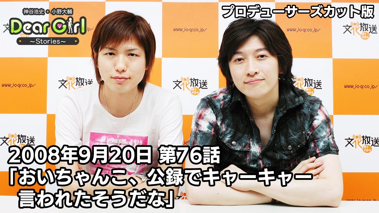 『神谷浩史・小野大輔のDear Girl〜Stories〜』<br>「第76話 おいちゃんこ、公録でキャーキャー言われたそうだな(2008年9月20日放送)」プロデューサーズカットバージョン<br><br>こちらでは、文化放送で放送中のラジオ番組『神谷浩史・小野大輔のDear Girl〜Stories〜』の<br>過去音源を再編集したものをDGSチャンネル会員向けに配信!<br><br>今回は第76回放送のプロデューサーズカットバージョンをお届けします。<br><br><br>『神谷浩史・小野大輔のDear Girl〜Stories〜』<br><br>文化放送 毎週(土)25時〜25時30分<br>ラジオ大阪 毎週(日)23時〜23時30分<br>インターネットサイマルラジオradikoでも聴取可能です。<br><br>・公式Twitter:<a href="https://twitter.com/uchi_P_" target="_blank" rel="noopener nofollow">https://twitter.com/uchi_P_</a><br>・番組メールアドレス:dgs@joqr.net<br>・番組公式サイト:<a href="https://pc.animelo.jp/special/deargirl-stories/" target="_blank" rel="noopener nofollow">https://pc.animelo.jp/special/deargirl-stories/</a><br>