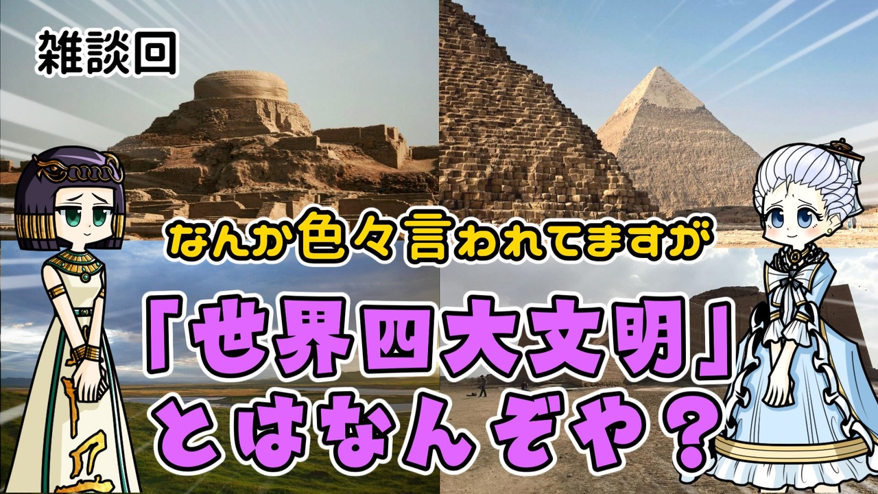 「世界四大文明」ってキャッチーな言葉で多くの人が知っているけど、批判もあります。そして、「士農工商」「1192つくろう鎌倉幕府」に並ぶ三大「今の教科書では乗ってない」ぶったたかれワードにも入ります。批判しやすいですからね。<br><br>じゃあそもそも四大文明ってくくりの由来はどこから来ているのか?なんで批判されているのか?世間の批判は妥当なのか?という感じのことをダラダラ語ります。なお半分くらいは中の人の感想なので、これで正解が出るわけではありません。あしからず。<br><br>☆ヒストリカの本がでたよ!知らない人はよろしくね!知ってる人もよろしくね!☆<br>Amazonリンク → <a href="https://amzn.asia/d/b5rlKvq" target="_blank" rel="noopener nofollow">https://amzn.asia/d/b5rlKvq</a><br><br>━━━━━━━━━━━━━━━━━━━━━<br>投稿者共通情報☆彡<br><br>BGM, SE:ニコニ・コモンズ様<br><a href="http://commons.nicovideo.jp/" target="_blank" rel="noopener nofollow">http://commons.nicovideo.jp/</a><br>魔王魂様<br><a href="https://maoudamashii.jokersounds.com/" target="_blank" rel="noopener nofollow">https://maoudamashii.jokersounds.com/</a><br>Audiostock様<br><a href="https://audiostock.jp/" target="_blank" rel="noopener nofollow">https://audiostock.jp/</a><br><br>立ち絵 霊夢・魔理沙(黒子式):nicotalk様<br><a href="http://www.nicotalk.com/charasozai.html" target="_blank" rel="noopener nofollow">http://www.nicotalk.com/charasozai.html</a><br><br>立ち絵 パトラ、マリー、アン、メアリ:ライフライフ様<br><a href="https://0801lifelife.tumblr.com/" target="_blank" rel="noopener nofollow">https://0801lifelife.tumblr.com/</a><br><br>使用ツール1:ゆっくりムービーメーカー4<br><a href="https://manjubox.net/ymm4/" target="_blank" rel="noopener nofollow">https://manjubox.net/ymm4/</a><br><br>使用ツール2:AviUtl<br><a href="http://spring-fragrance.mints.ne.jp/aviutl/" target="_blank" rel="noopener nofollow">http://spring-fragrance.mints.ne.jp/aviutl/</a><br><br>各時代の地図 : World History Maps & Timelines <br><a href="http://geacron.com/home-en/" target="_blank" rel="noopener nofollow">http://geacron.com/home-en/</a><br><br>ゆっくりボイスについて:AquesTalkライセンス取得済み<br><br>キャラクターボイス<br>アン・ボニー:羽ノ華(A.I.VOICE)<br>メアリ・リード:琴葉 葵(A.I.VOICE)<br>クレオパトラ:結月ゆかり(VOICEROID2)<br>マリー‐アントワネット:東北きりたん (VOICEROID EX)<br><br>AivisSpeech<br><br><br>その他フリー素材ご提供元の皆様に圧倒的感謝<br><br><br>