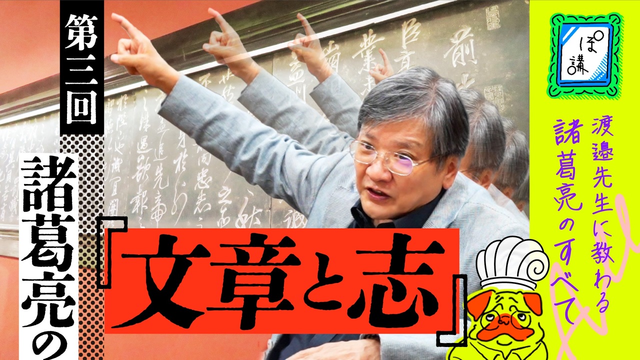 渡邉先生による諸葛亮講座、第3回は「諸葛亮の文章と志」について。<br>「隆中対」「出師表」という諸葛亮の印象的なシーン基に解説いただきます。<br><br>今回の収録は渡邉先生の書籍『諸葛孔明 陳寿が『三国志』に秘した真実(潮新書)』を元にした動画となります!諸葛亮の決定版書籍とのことですので気になる方はぜひぜひ購入してみてくださいー!<br><a href="https://usio.co.jp/books/ushio_shinsyo/28624" target="_blank" rel="noopener nofollow">https://usio.co.jp/books/ushio_shinsyo/28624</a><br><br>▼〜諸葛亮のすべて〜シリーズ<br>・第1回「諸葛亮の学問」<br><a href="https://www.nicovideo.jp/watch/so45592214" target="_blank" rel="noopener nofollow">https://www.nicovideo.jp/watch/so45592214</a><br><br>・第2回「諸葛亮の人間関係」<br><a href="https://www.nicovideo.jp/watch/so45629440" target="_blank" rel="noopener nofollow">https://www.nicovideo.jp/watch/so45629440</a><br><br>・第4回「諸葛亮の軍事」<br><a href="https://www.nicovideo.jp/watch/so45733545" target="_blank" rel="noopener nofollow">https://www.nicovideo.jp/watch/so45733545</a><br><br>▼ぽ講中国史シリーズ<br>・第1回「漢の全体像と時代区分」<br><a href="https://www.nicovideo.jp/watch/so44862409" target="_blank" rel="noopener nofollow">https://www.nicovideo.jp/watch/so44862409</a><br><br>・第2回「漢の統治者と制度の評価」<br><a href="https://www.nicovideo.jp/watch/so44909053" target="_blank" rel="noopener nofollow">https://www.nicovideo.jp/watch/so44909053</a><br><br>・第3回「王莽と三国時代の武将の先祖たち」<br><a href="https://www.nicovideo.jp/watch/so44959978" target="_blank" rel="noopener nofollow">https://www.nicovideo.jp/watch/so44959978</a><br><br>・第4回「漢の終わりと時代の評価」<br><a href="https://www.nicovideo.jp/watch/so45011150" target="_blank" rel="noopener nofollow">https://www.nicovideo.jp/watch/so45011150</a><br><br>・第5回「晋の始まりと終わり、台頭する宗教」<br><a href="https://www.nicovideo.jp/watch/so45119283" target="_blank" rel="noopener nofollow">https://www.nicovideo.jp/watch/so45119283</a><br><br>・最終回「三国時代の武将の末裔、晋という時代の評価」<br><a href="https://www.nicovideo.jp/watch/so45212968" target="_blank" rel="noopener nofollow">https://www.nicovideo.jp/watch/so45212968</a><br><br>▼その他「ぽ講」シリーズ<br>精神科医と考える、身近な人の「死」の受け入れ方|ぽ講001<br><a href="https://www.nicovideo.jp/watch/so44814270" target="_blank" rel="noopener nofollow">https://www.nicovideo.jp/watch/so44814270</a><br><br>《橋の良さみ入門 #01》橋の風景の読み方|ぽ講006<br><a href="https://www.nicovideo.jp/watch/so45076929" target="_blank" rel="noopener nofollow">https://www.nicovideo.jp/watch/so45076929</a><br><br>毎日楽しく生きるためのファッション哲学 -序説-|ファ哲#01|ぽ講013<br><a href="https://www.nicovideo.jp/watch/so45263031" target="_blank" rel="noopener nofollow">https://www.nicovideo.jp/watch/so45263031</a><br>